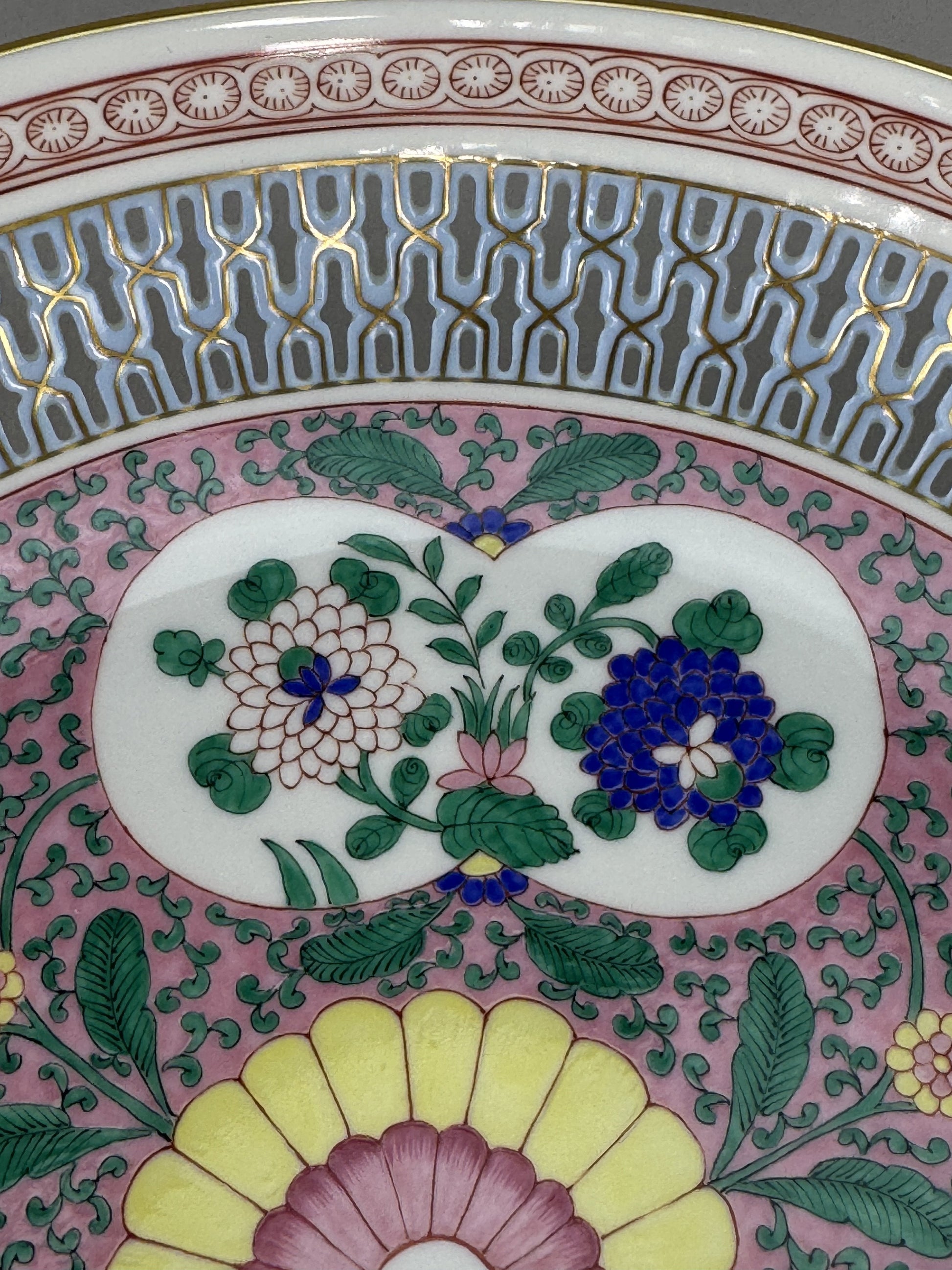 Presented is a wonderful Herend porcelain bowl or dish. The bowl is made in the pattern named Emaille Rose or Enamel Rose, which is a Chinoiserie pattern featuring rich green vines against a famille rose pink enamel ground. Breaking up the pink and green are auspicious peach shaped reserves with colorful flowers hand painted inside, while the center is done in a stylized floral design. The dish has a wide reticulated rim, done in a fabulous openwork design with fine gold gilt detailing. The back has a pierced foot rim, so wires for hanging the plate as a display piece could easily be added. Please note we have some additional pieces in this pattern, which can be found by searching “Emaille Rose” in our store.