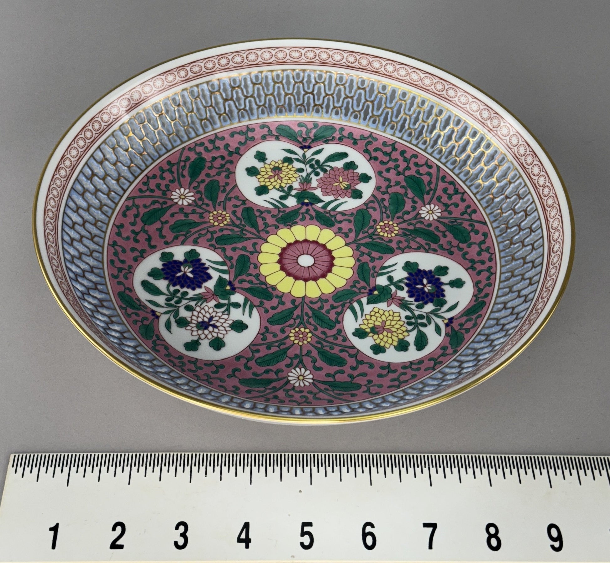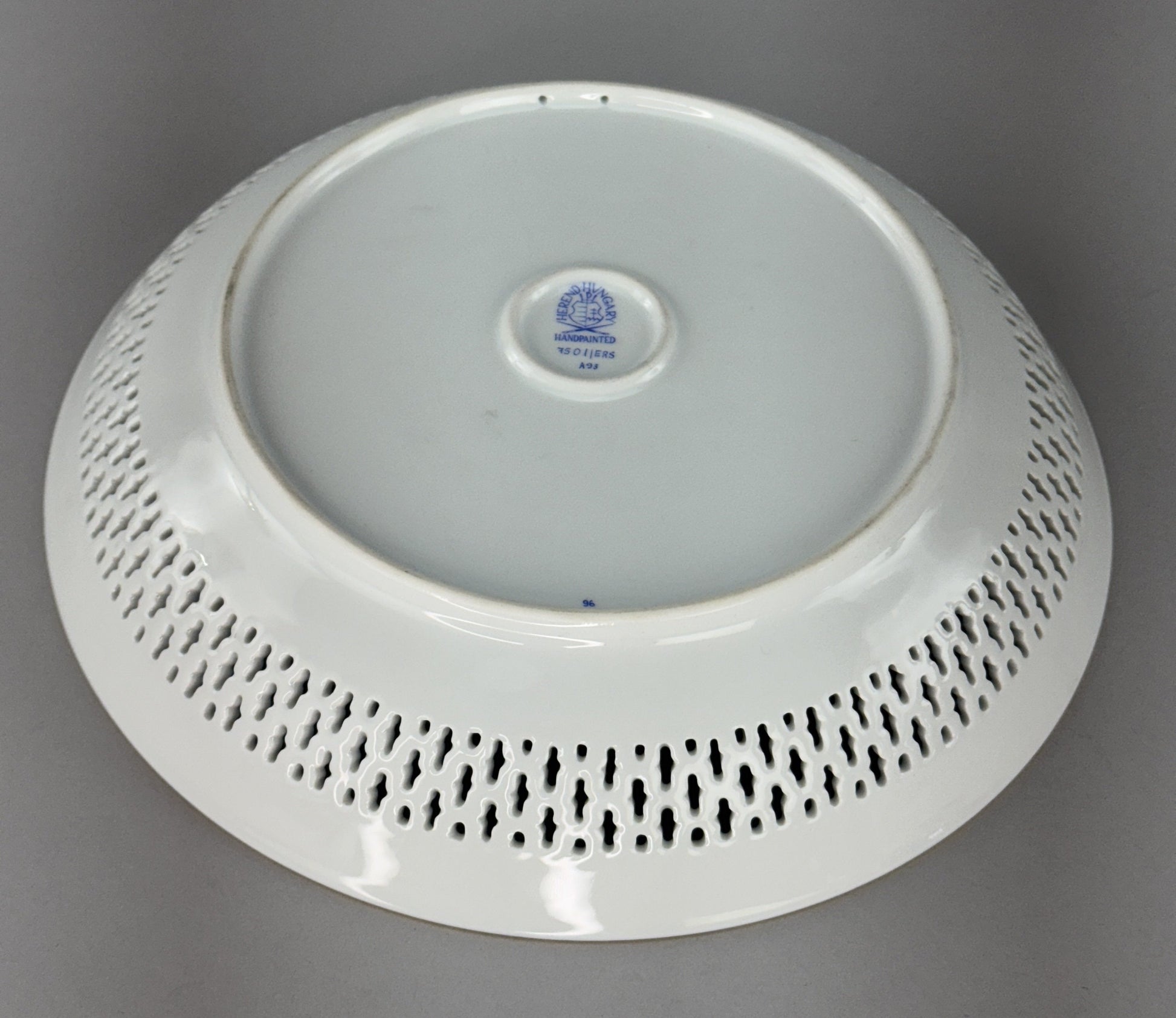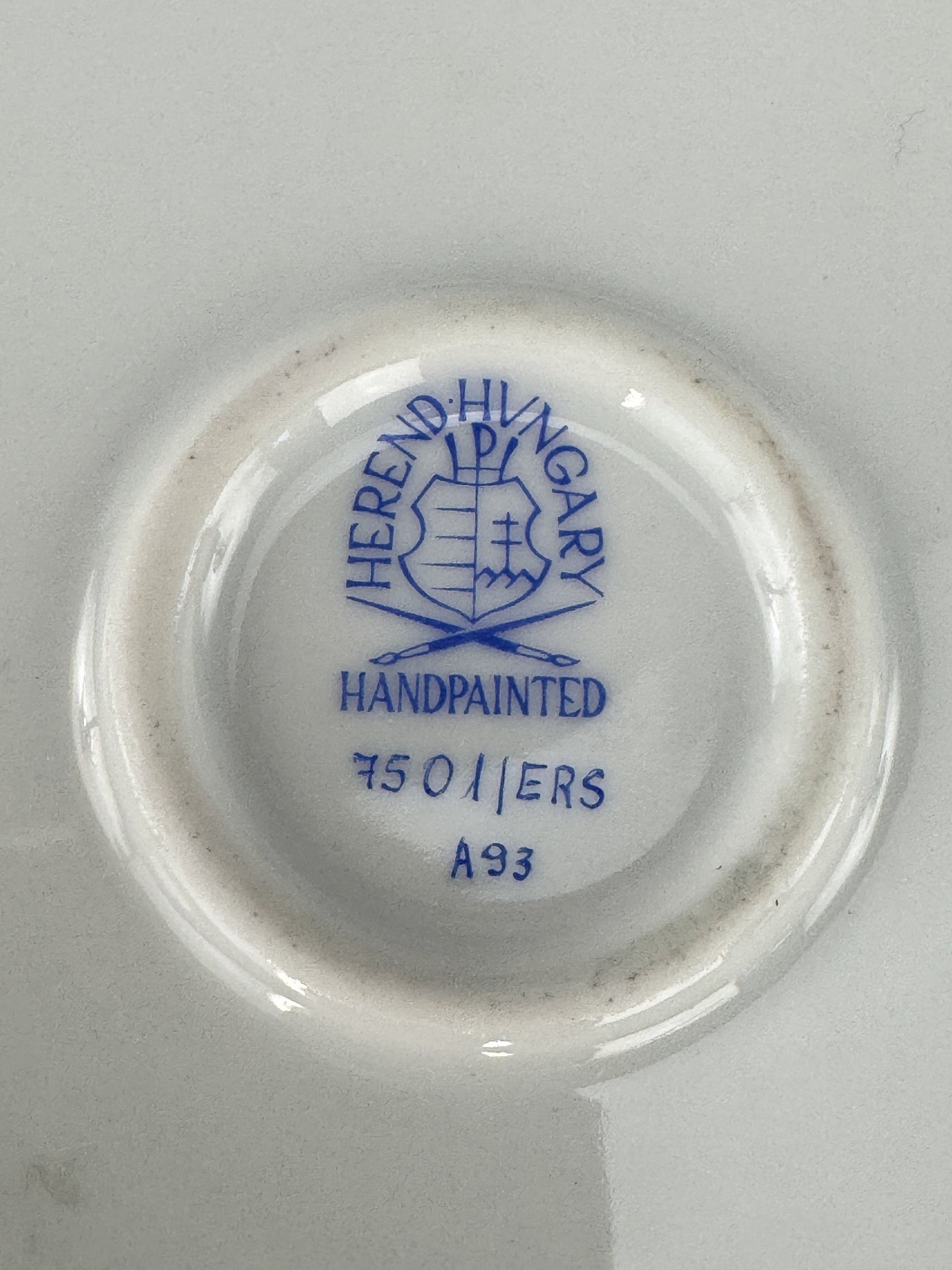 This plate is in excellent condition. There are no chips, no cracks, no breaks, and no repairs. The underside of the bowl is signed Herend, Hungary and “Handpainted” with pattern/decoration numbers7501/ERS A93 beneath, as well as the number 96 in blue near the outer edge. Though this piece does not have an artist's signature, other pieces in the same pattern that we acquired as part of a lot have a signature that looks like Szmulsi Istvanne; artist signatures on Herend pieces signify pieces of exceptional quality.