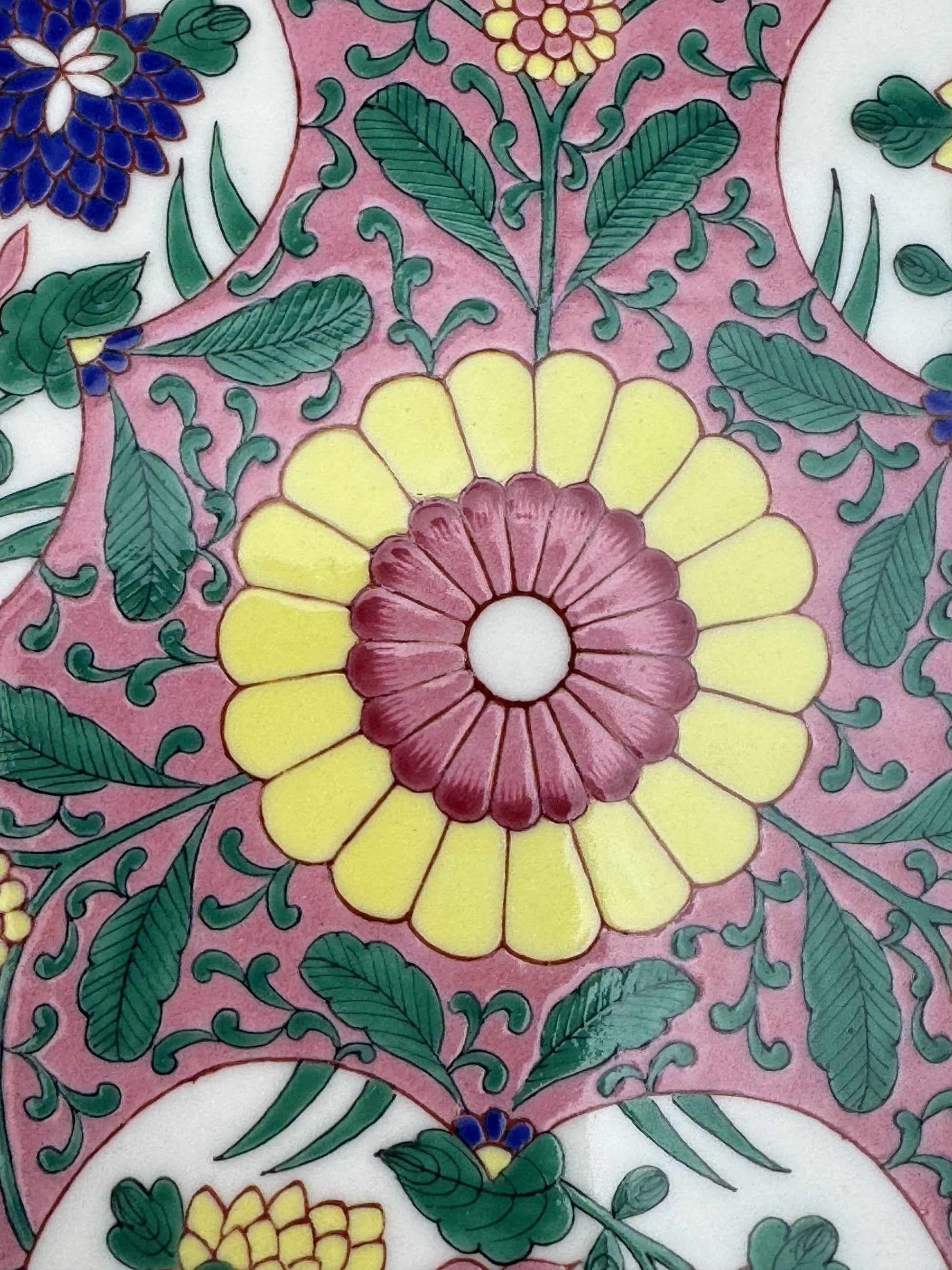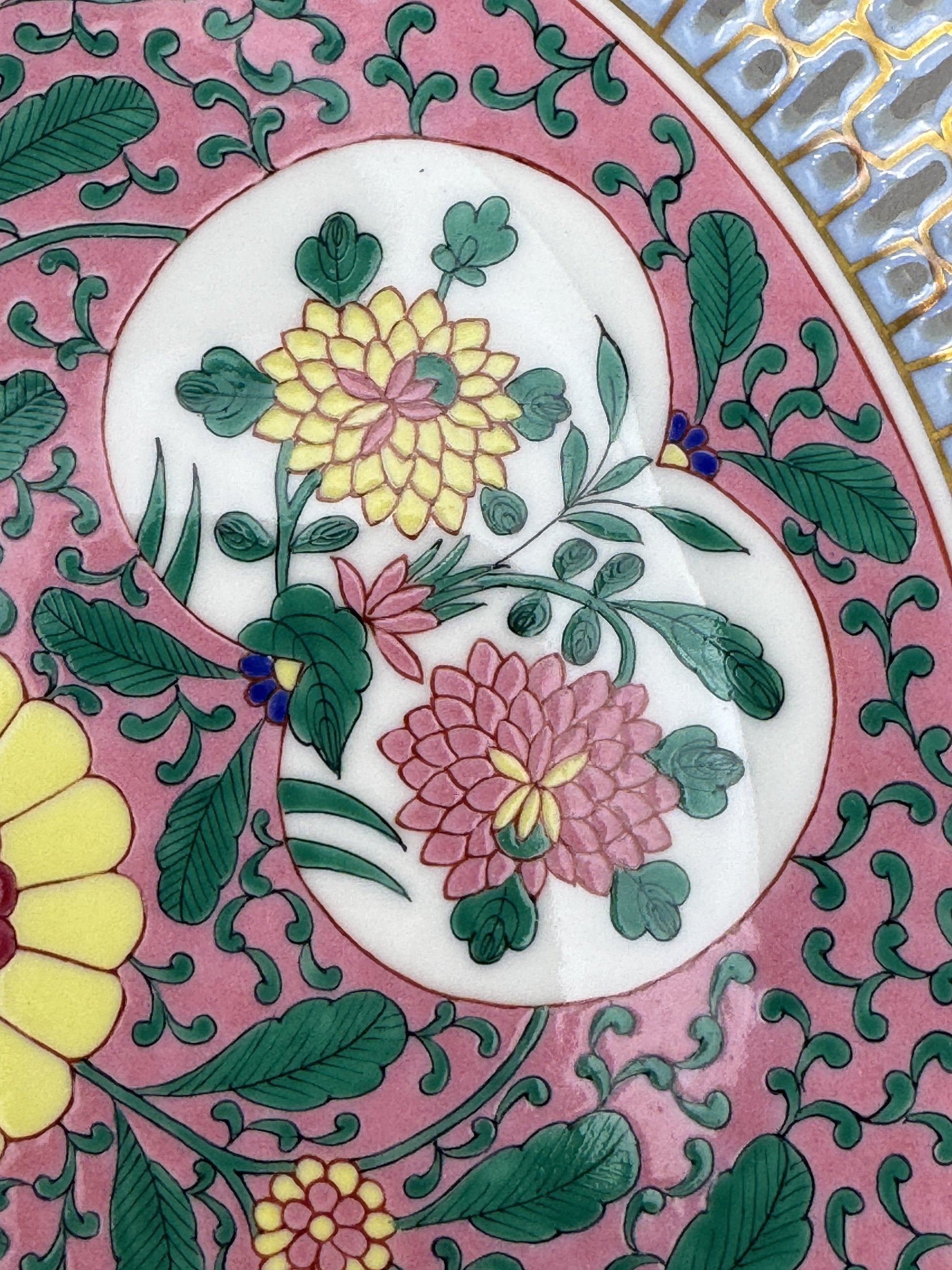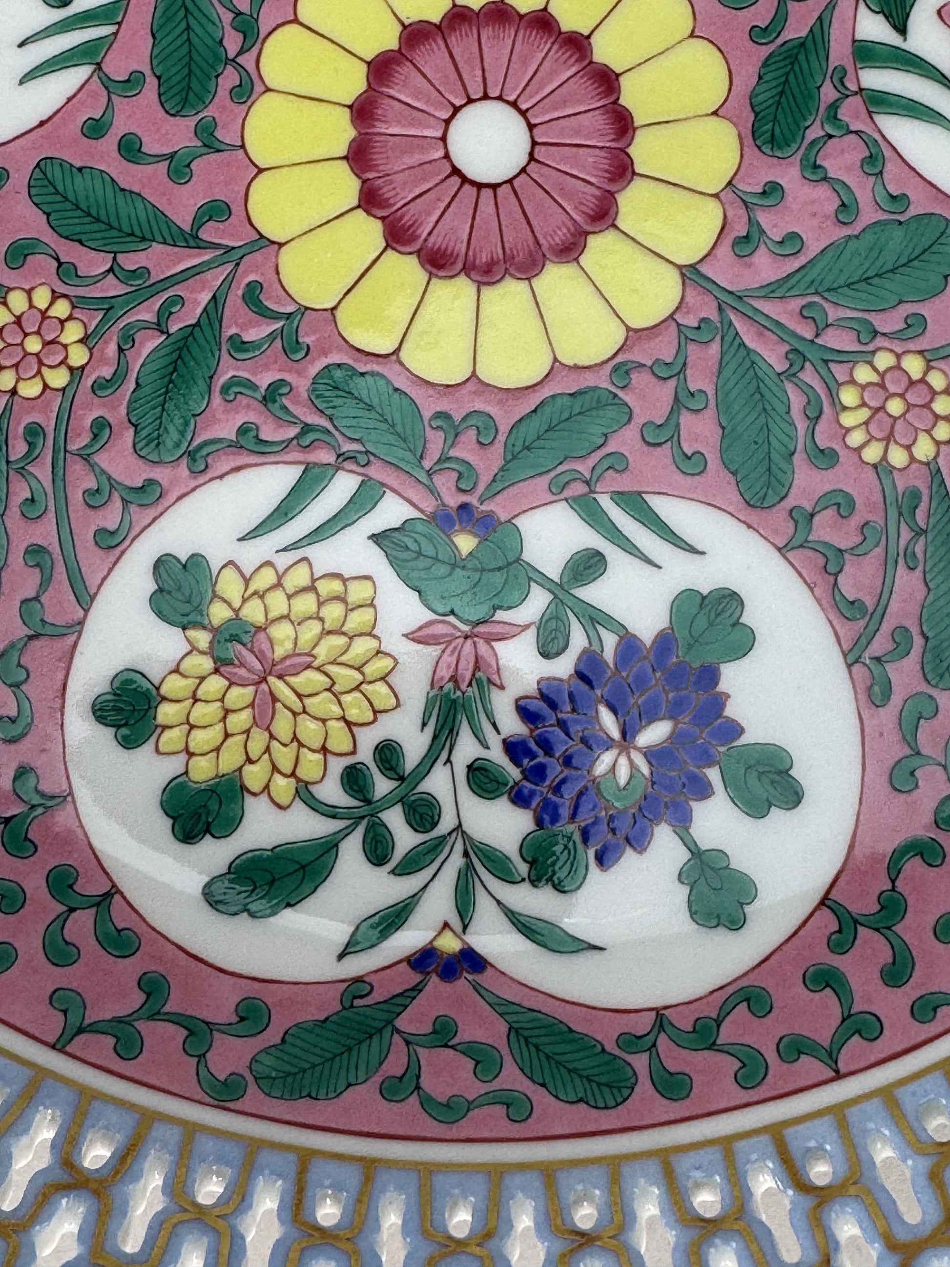 Presented is a wonderful Herend porcelain bowl or dish. The bowl is made in the pattern named Emaille Rose or Enamel Rose, which is a Chinoiserie pattern featuring rich green vines against a famille rose pink enamel ground. Breaking up the pink and green are auspicious peach shaped reserves with colorful flowers hand painted inside, while the center is done in a stylized floral design. The dish has a wide reticulated rim, done in a fabulous openwork design with fine gold gilt detailing. The back has a pierced foot rim, so wires for hanging the plate as a display piece could easily be added. Please note we have some additional pieces in this pattern, which can be found by searching “Emaille Rose” in our store.