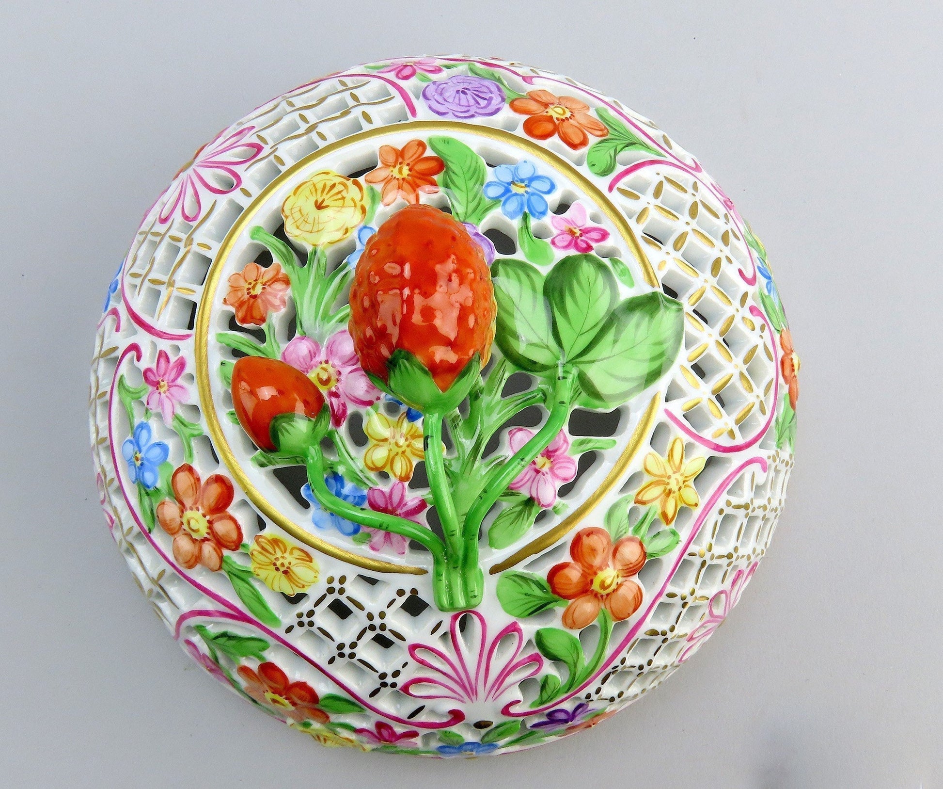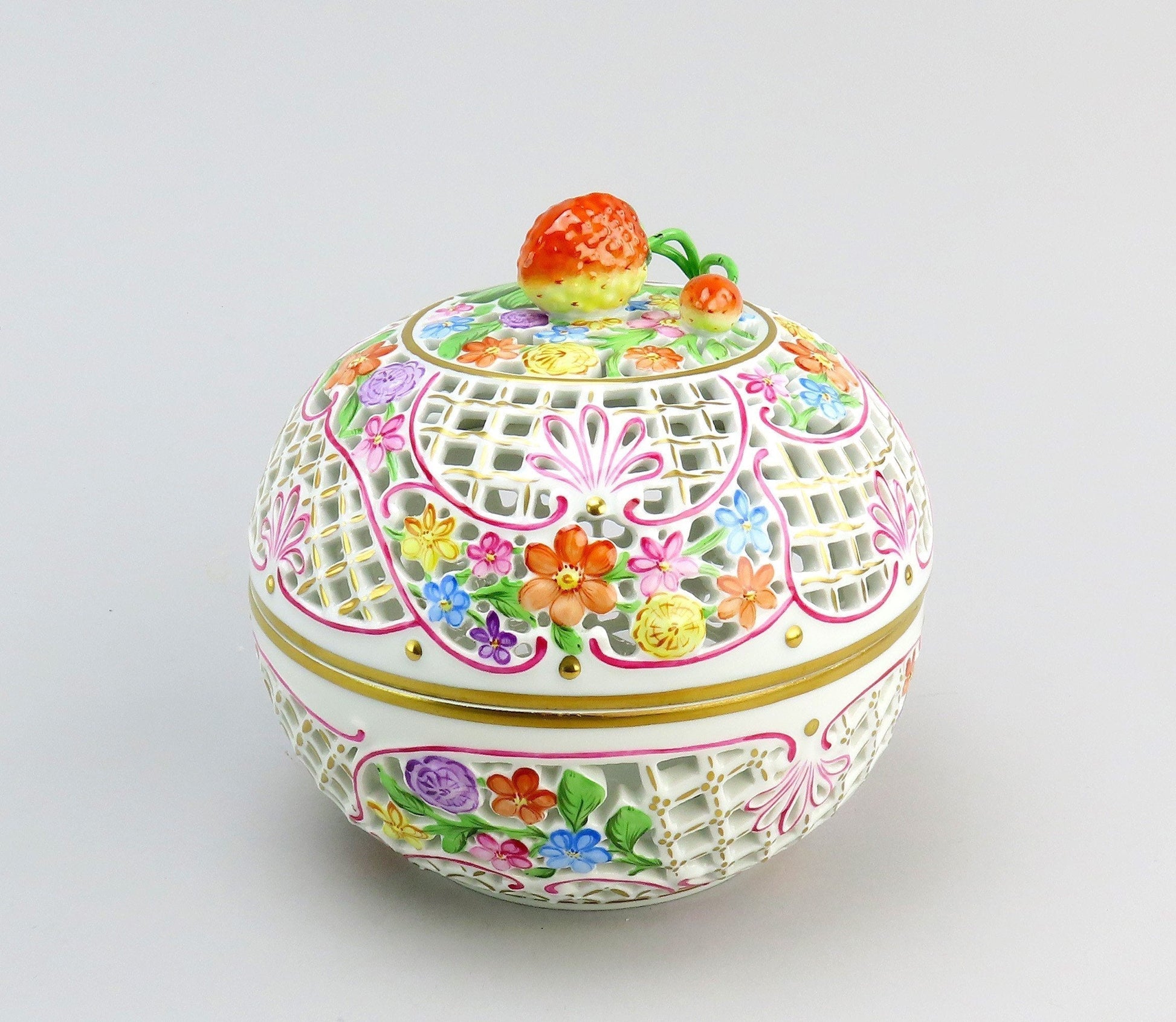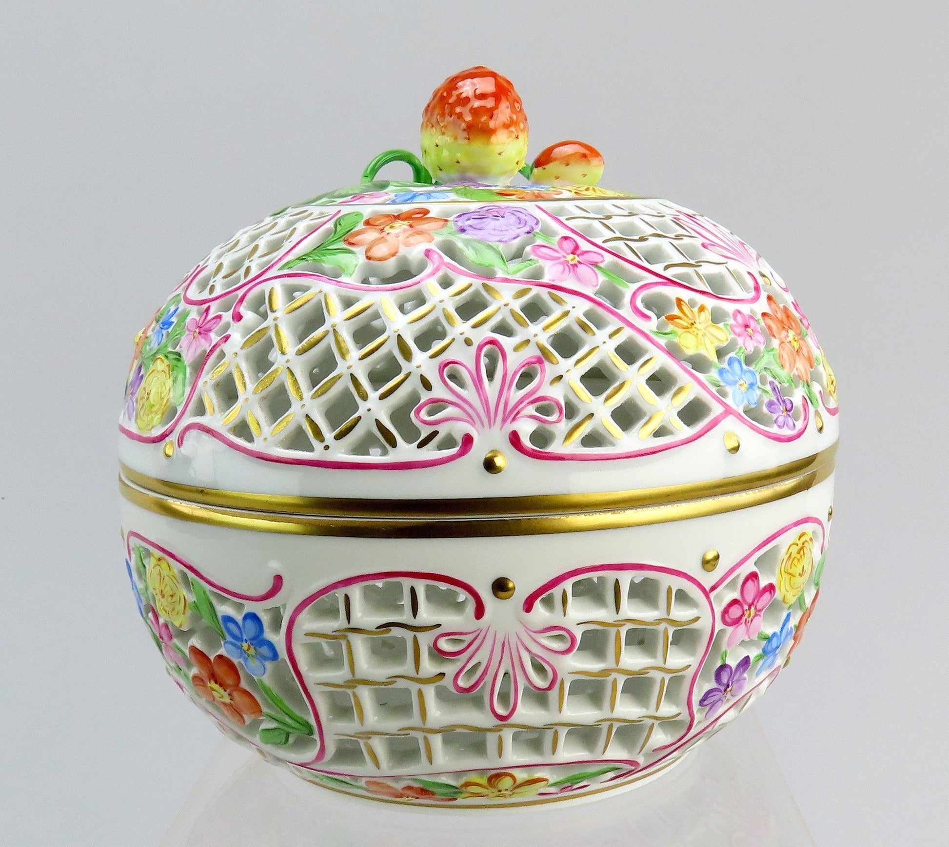 Presented is a lovely vintage Herend porcelain reticulated potpourri or covered box. The box is round, opening at the midpoint, with intricate openwork decoration throughout both halves. The exterior is beautifully hand painted with colorful flowers and pink ribbon decorations, and the lid has a figural finial in the form of a strawberry, which is very charming. Great as a potpourri bowl, a bonbon/candy dish, or just a trinket dish. This is one of the larger sizes of this design, if not the very largest, and has a real presence in person.
