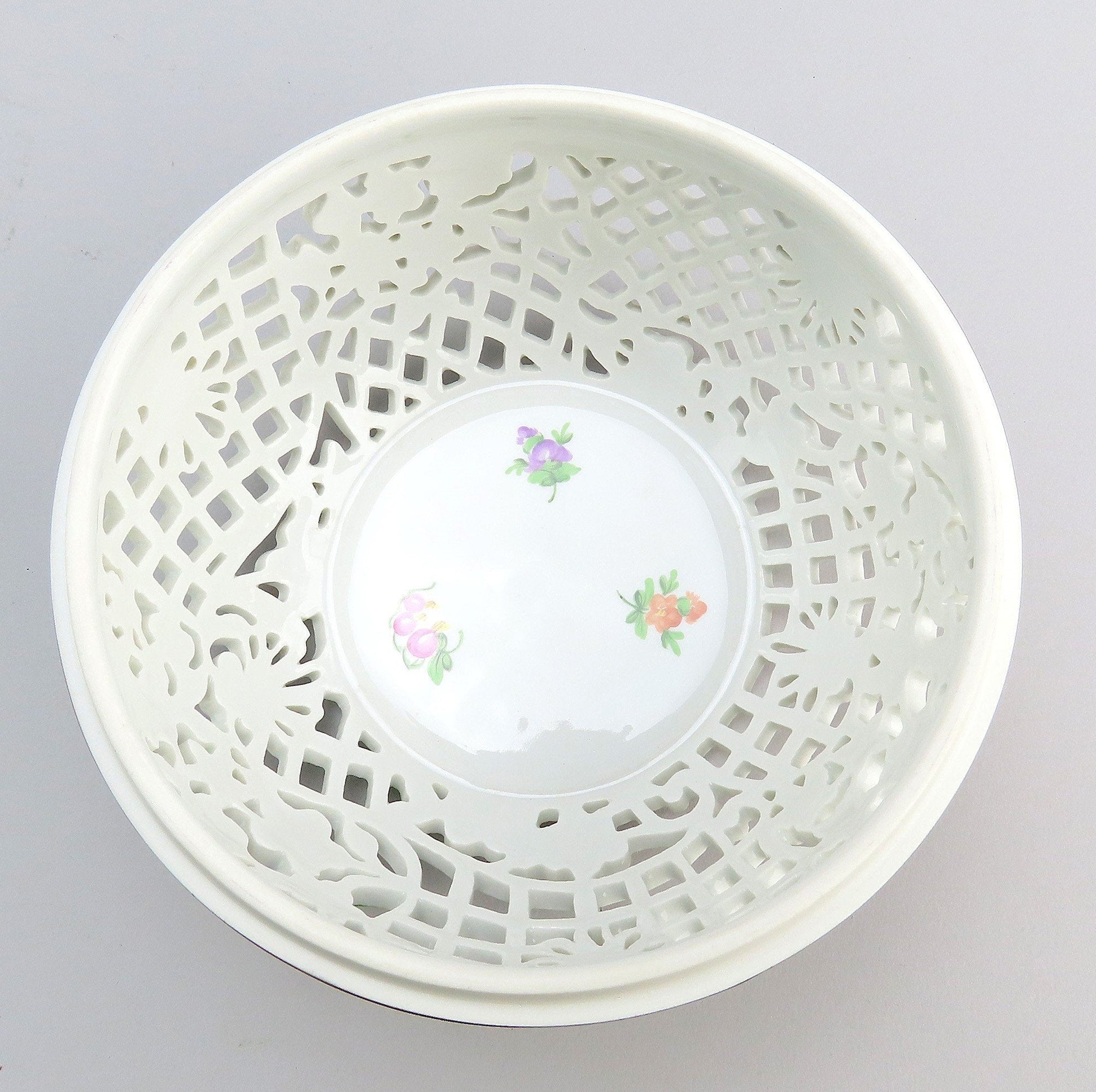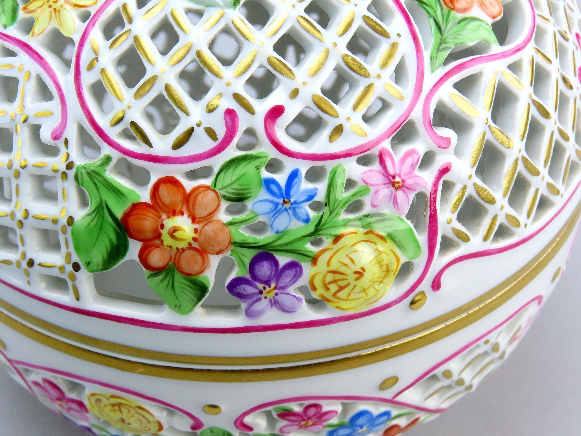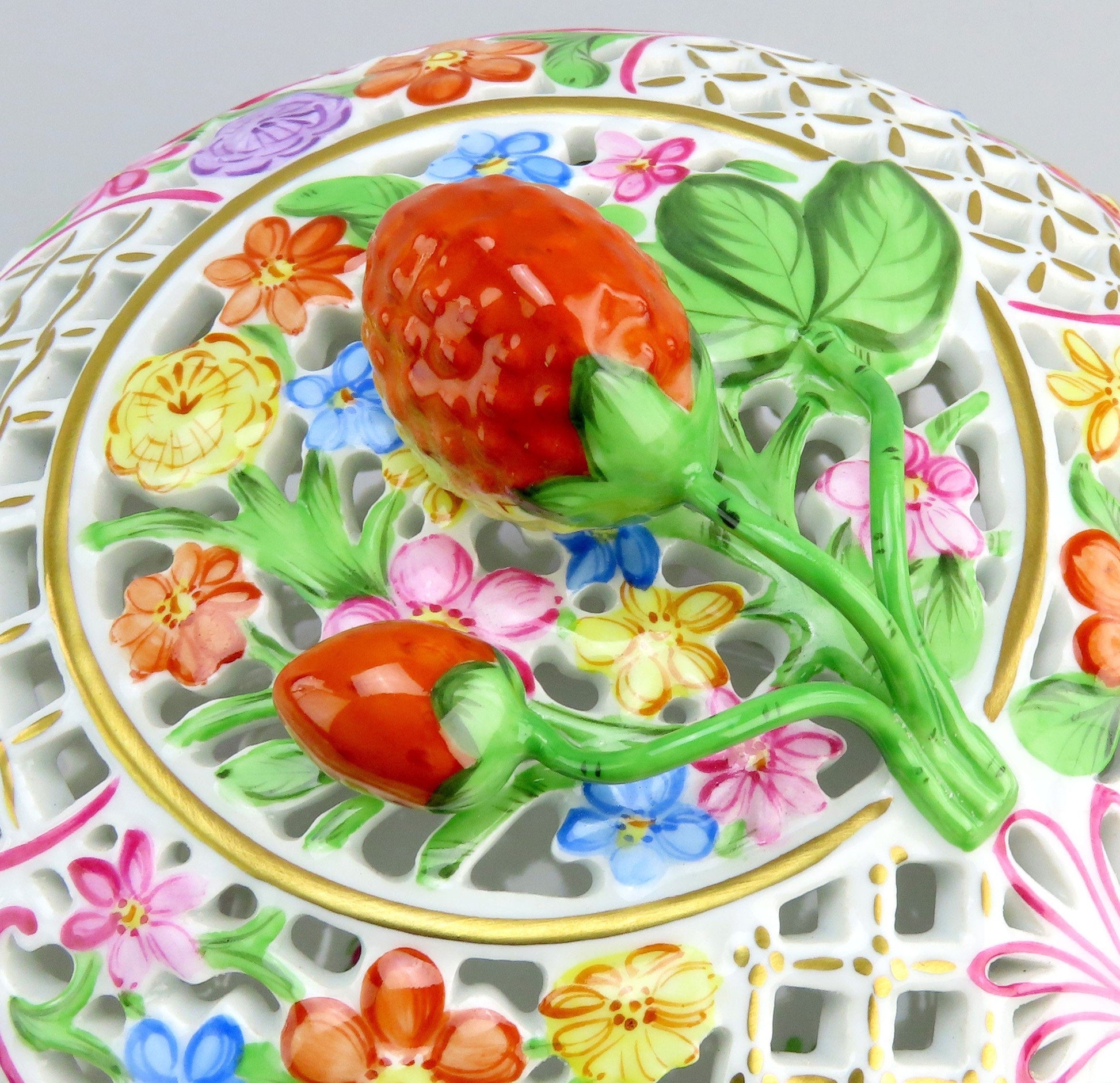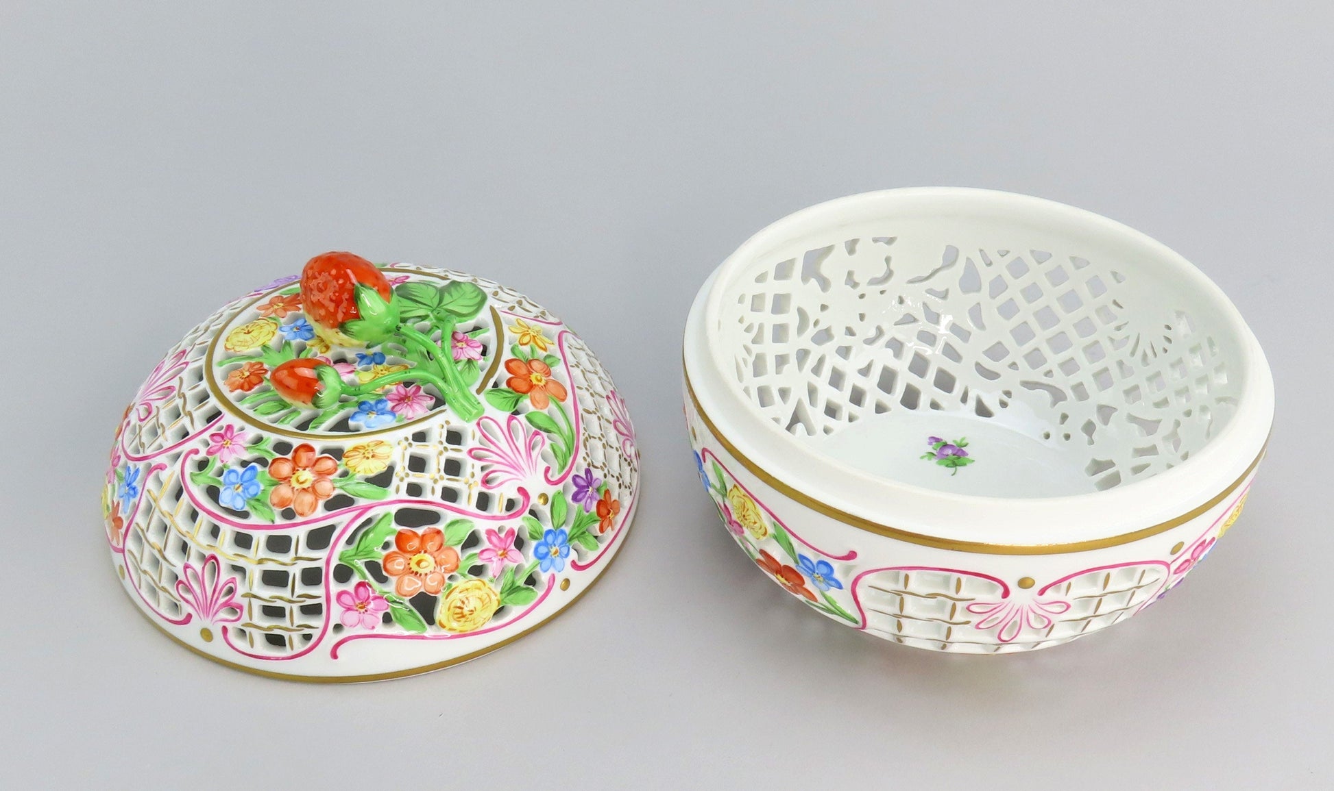 Presented is a lovely vintage Herend porcelain reticulated potpourri or covered box. The box is round, opening at the midpoint, with intricate openwork decoration throughout both halves. The exterior is beautifully hand painted with colorful flowers and pink ribbon decorations, and the lid has a figural finial in the form of a strawberry, which is very charming. Great as a potpourri bowl, a bonbon/candy dish, or just a trinket dish. This is one of the larger sizes of this design, if not the very largest, and has a real presence in person.