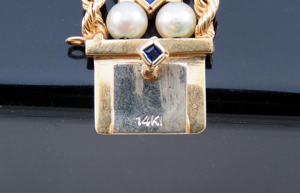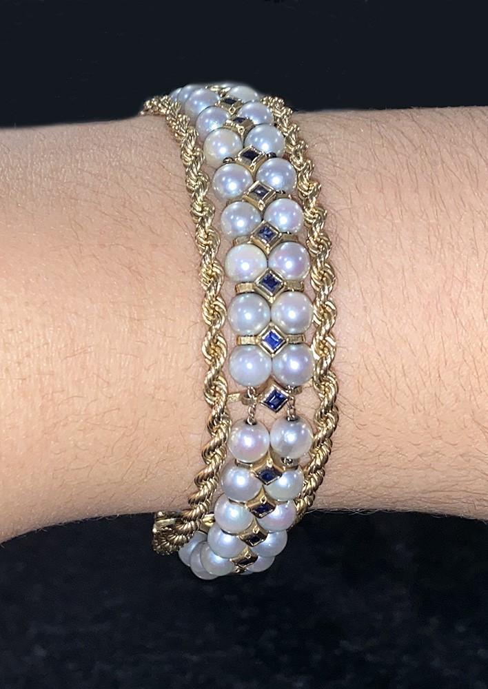 High End 14K Yellow Gold Pearl & 1CT Sapphire Gemstone Rope Twist Bracelet 7.25"