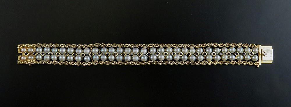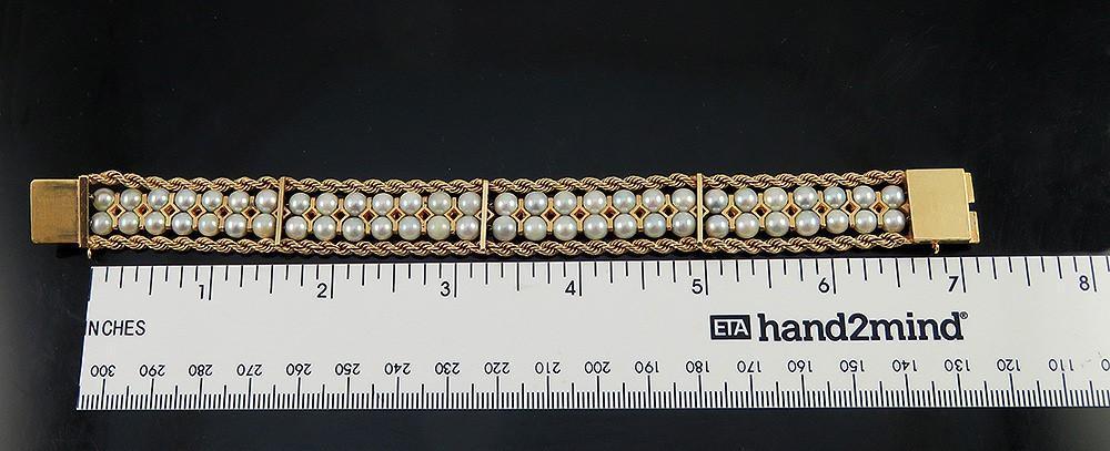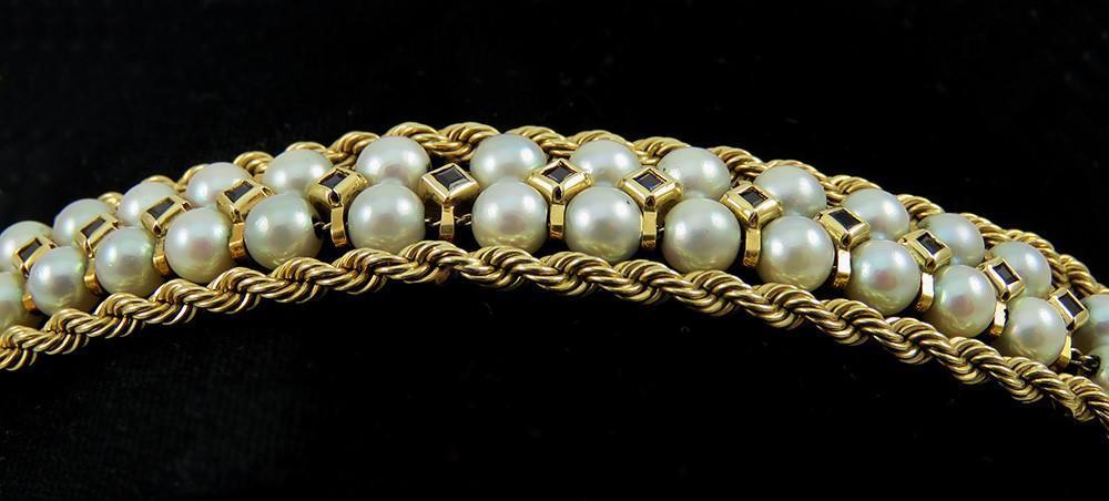 Presented is a very fine quality, 14 karat yellow gold, pearl and natural sapphire gemstone bracelet made in America around the mid 1900s. The statement bracelet has two rows of pearls with gold spacers set with sapphires. There is approximately 1 carat of total sapphire gemstone weight. The edges are comprised of twisted gold chains. The plunger style clasp is secure. There are small loops for a safety chain to be added if need be.