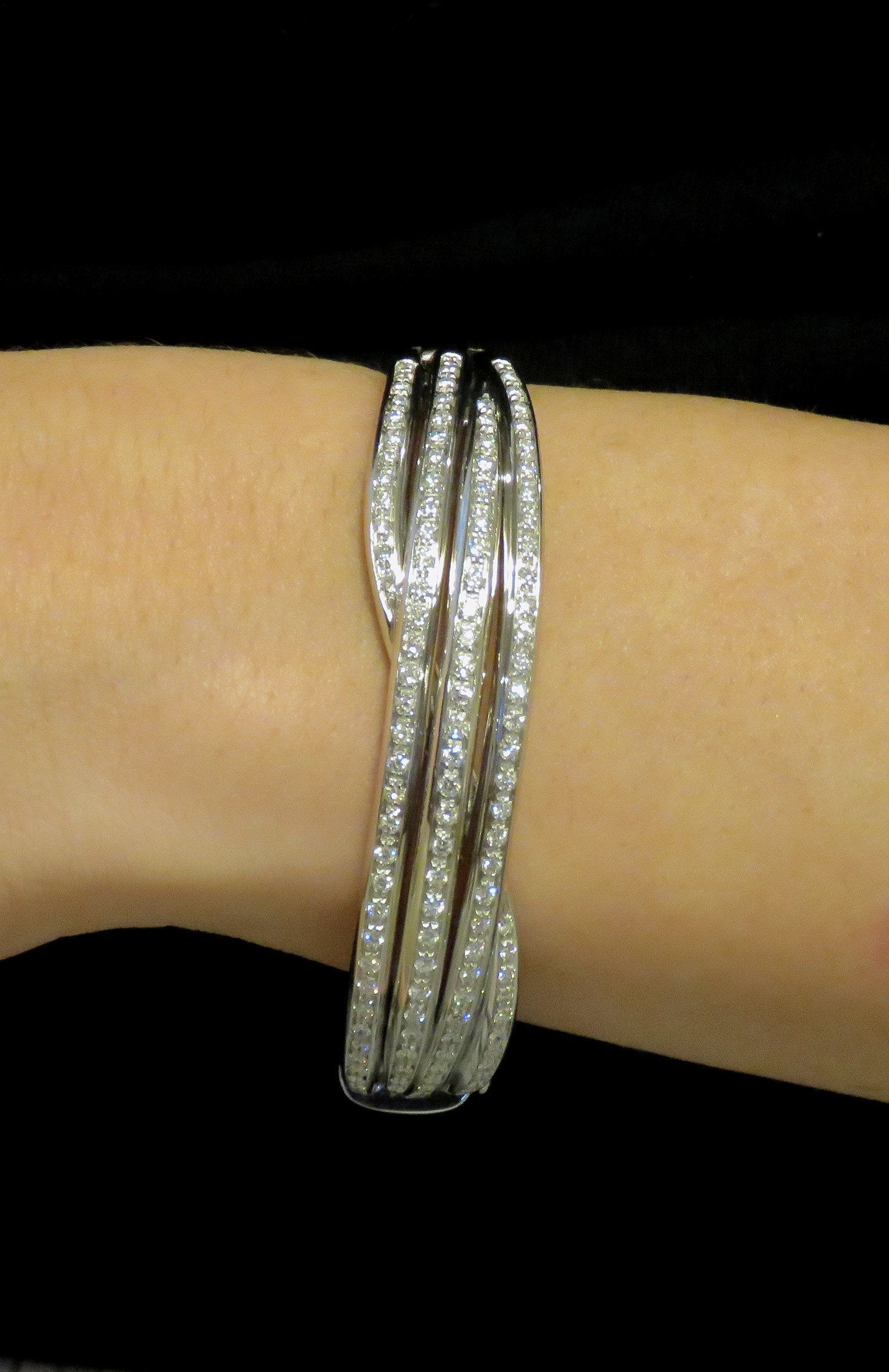 Presented is a gorgeous 18 karat white gold and natural diamond gemstone bangle bracelet. The top of the wide bangle bracelet is done in an openwork band form and is securely set with 124 natural modern brilliant cut diamonds. The diamonds are 2 to 2.5 points each in weight, for a total diamond weight of at least 2.5 carats, maybe as much as 3.25 carats. The diamonds are vibrant, dazzling stones mostly of VS clarity, some as high as VVS-2, and near colorless F/G color. This is a very high end bracelet, with a wonderful feeling of weight and quality on the wrist, it is solid, well constructed, and the diamonds are very high quality. The clasp works great and has a safety latch for added security. The bracelet is a hinged design, so it is easy to put on.