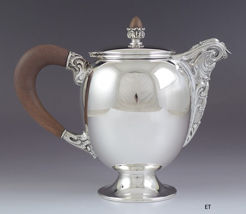 Presented is a superb quality Peruvian sterling silver teapot or coffee pot. The pot is done in a handsome classical form, with a finial and handle carved from rich mellow wood. The spout, top and base of the handle, and the finial feature beautifully cast and applied designs of scrolled acanthus leaves, in high, detailed relief, for a wonderful textural element. The interior of the pot is spotlessly clean, while the exterior is polished to a bright high finish, ready for use or display.
