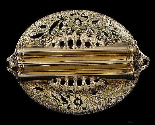 Presented is an old 14 karat yellow gold pin made during the mid to late 1800s. This high Victorian piece is very finely engraved with texture and enameled with black flowers. The middle has a shaped bar piece going across it. There is a small hook on the back to hang a fob or small charm.