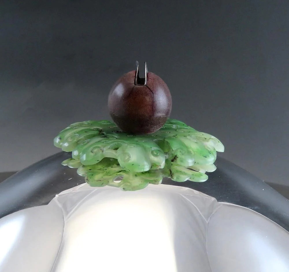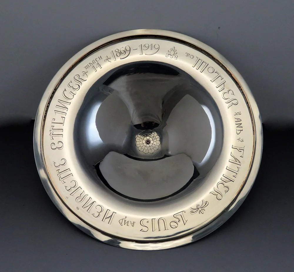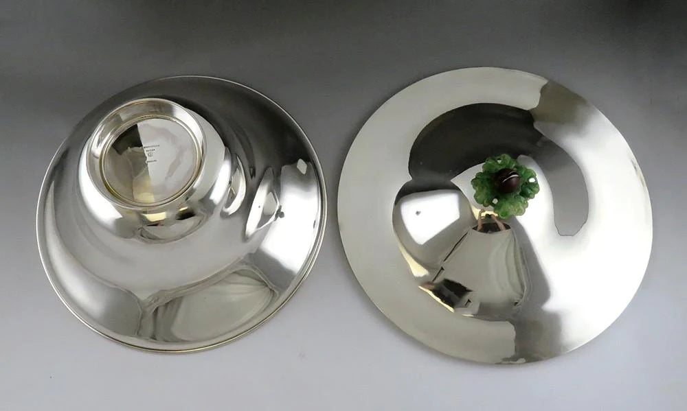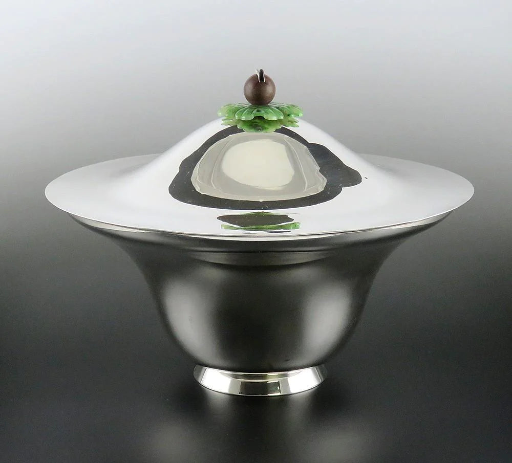 Presented is an antique, solid sterling silver covered bowl or dish made by Marie Zimmermann in 1919. This old piece was completely hand crafted and is done in a classic, Art Deco form. The large lid has a very interesting finial that is comprised of a jade stone that is beautifully carved into a leaf form and a hollowed out nut or wooden ball in the center. The underside of the lid has a fabulous quality inscription that reads: To Mother and Father, Louis and Henriette Ettlinger, March 14, 1869 - 1919. This is a very large, eye-catching piece.