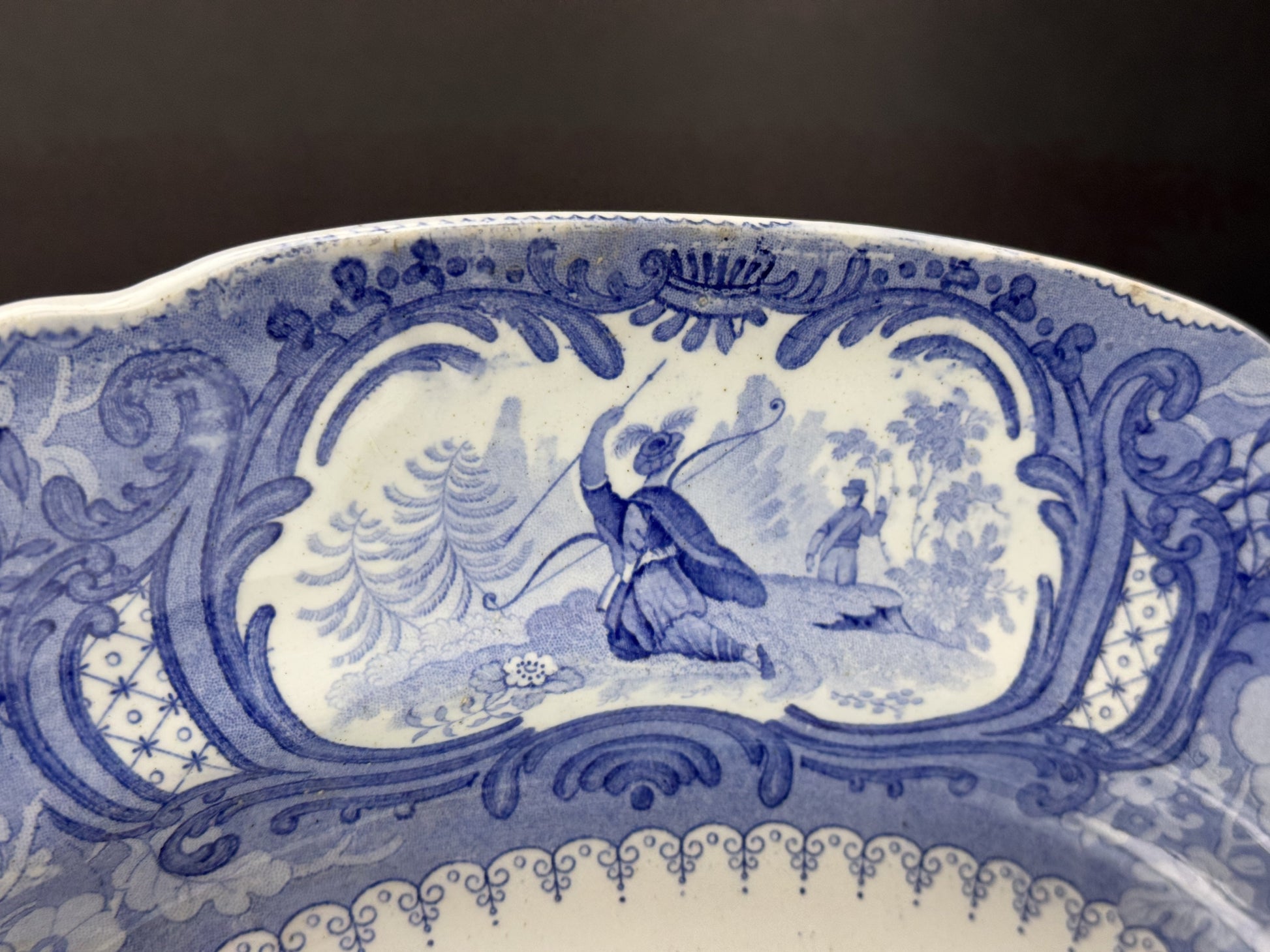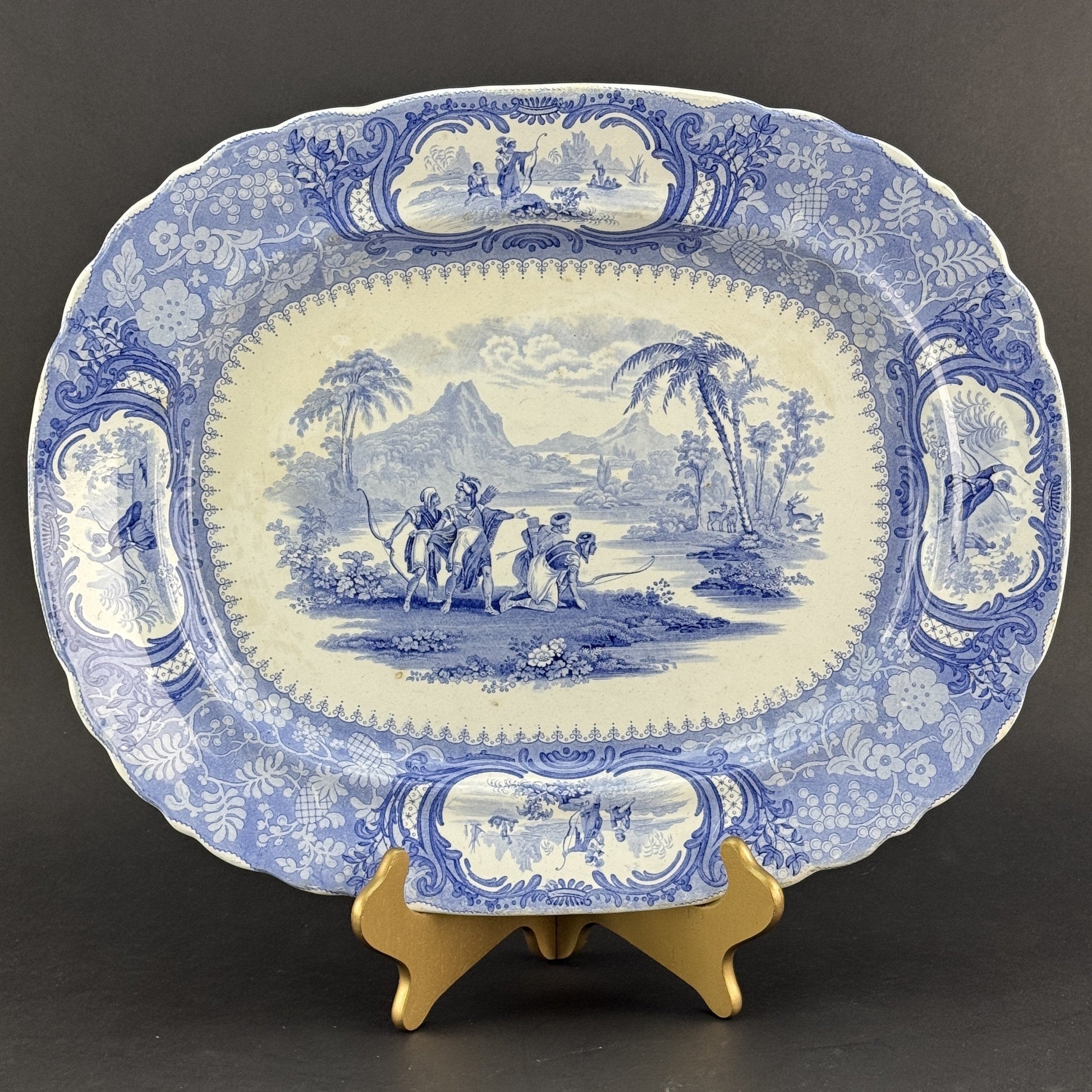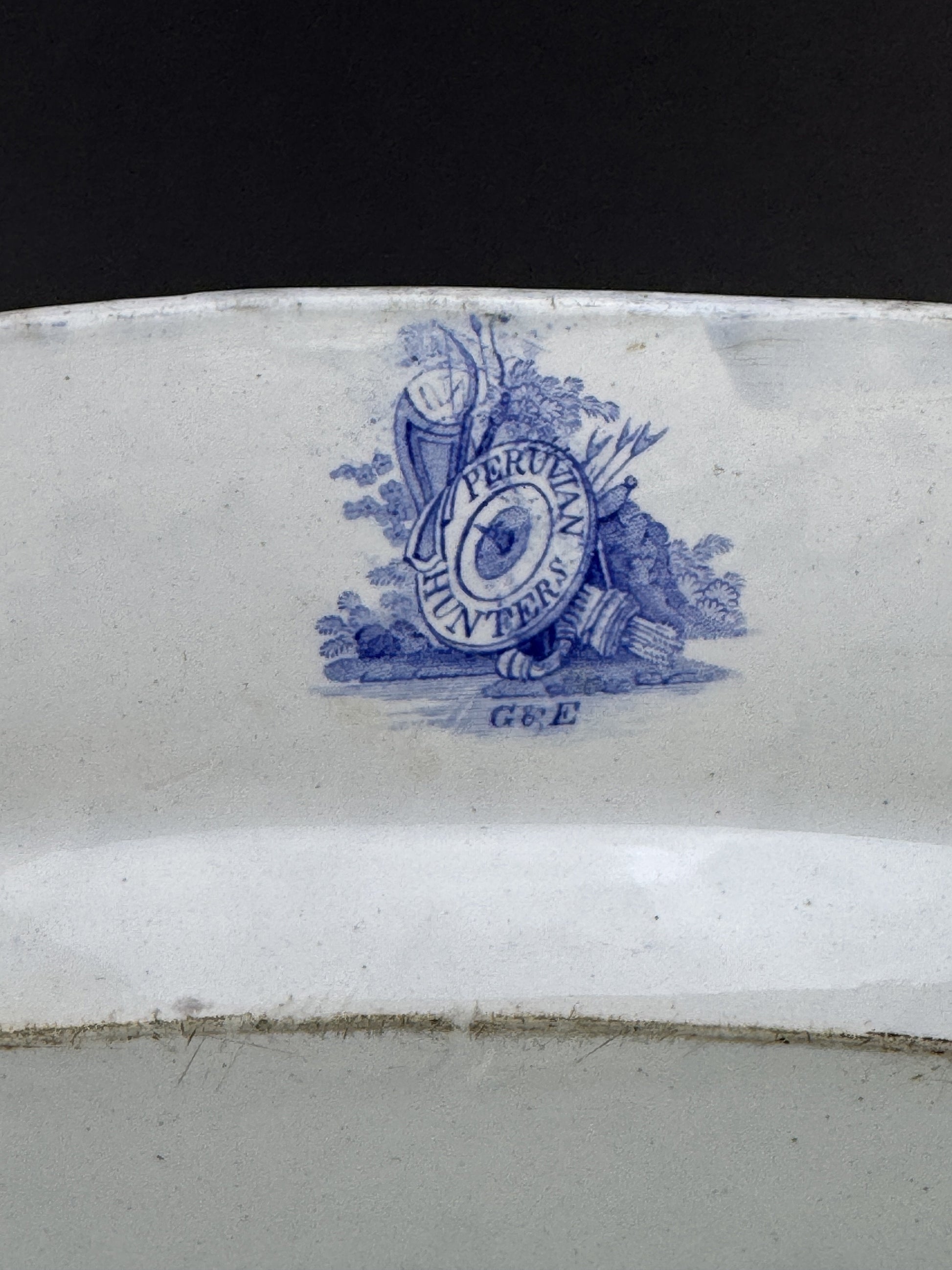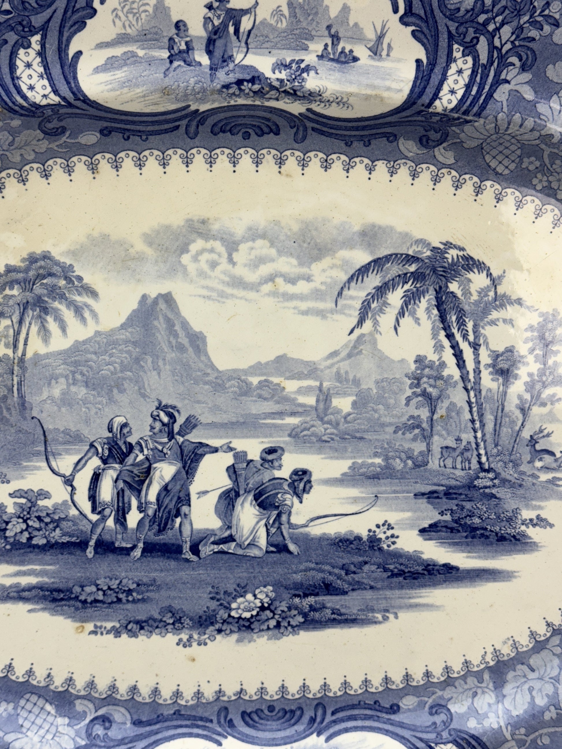 Huge c1840 English Staffordshire Peruvian Hunters Blue White Large Platter