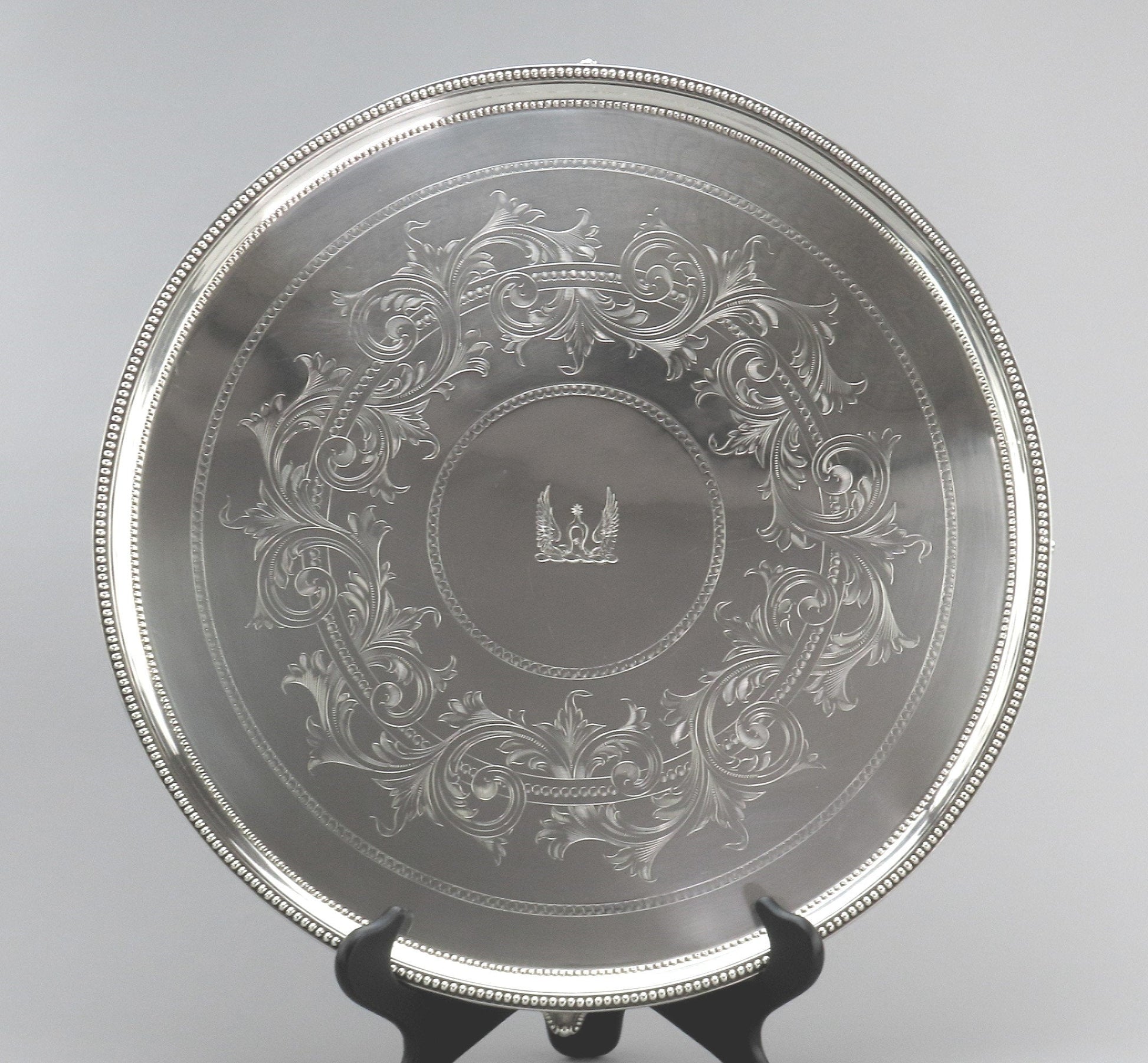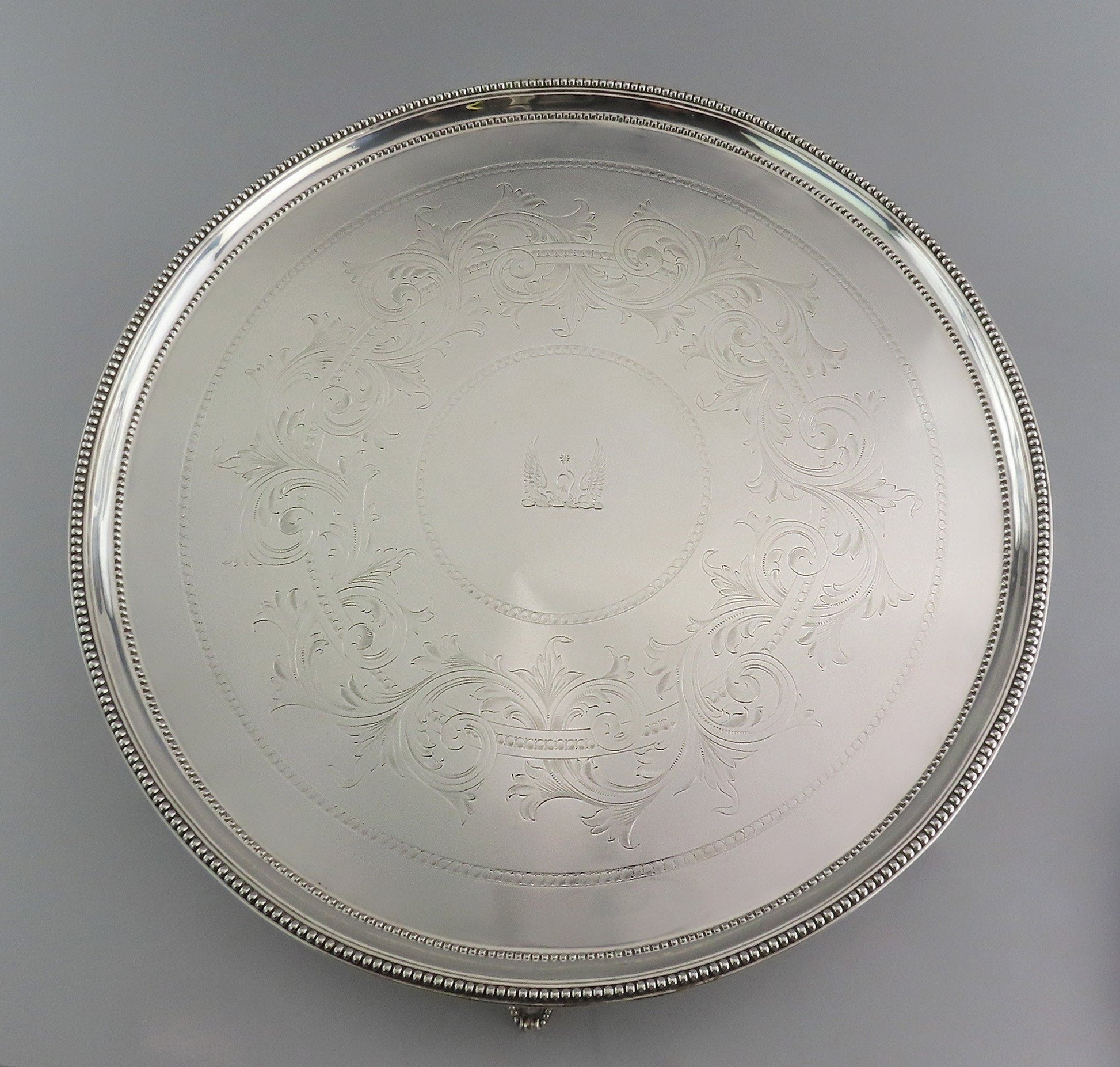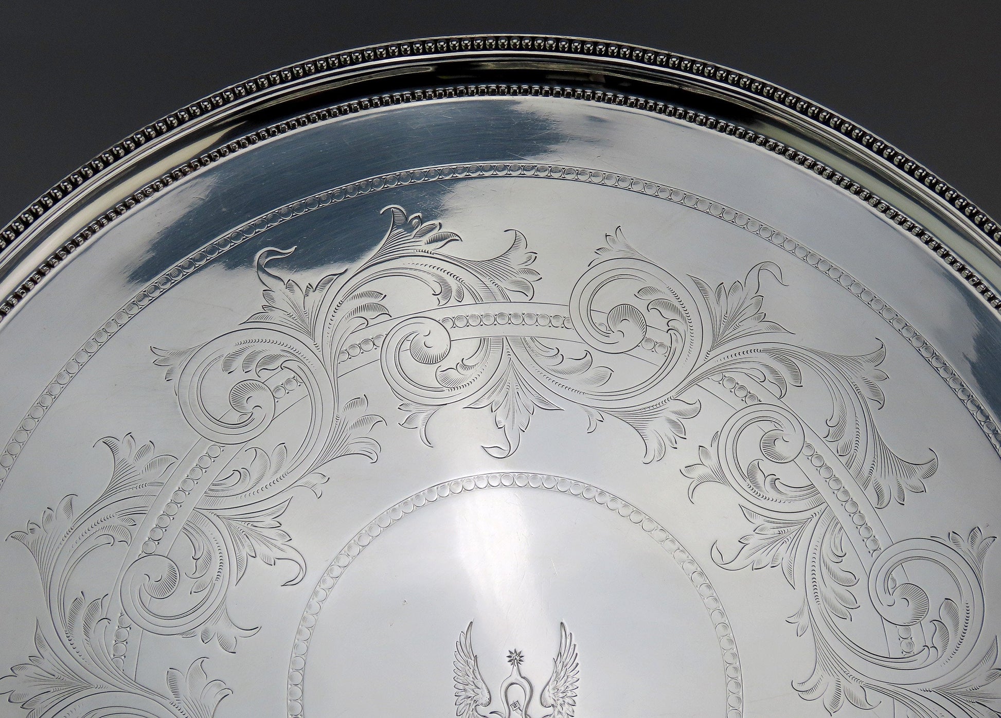 Presented is an excellent English Georgian sterling silver large serving tray, dated 1781. The tray is round and stands on four scroll form feet. The tray has a wide, continuous band of finely hand engraved decoration, in the form of foliate scrollwork entwining and between beadwork bands, all richly detailed and well done. The engraved beadwork decoration matches a raised beadwork border around the rim, the interior, and the feet of the tray. The center of the tray has a crest of a spur and leather between raised wings, associated with the Beeching, Annandale, and Capp family names, likely others as well. The tray is a good large size, likely able to accommodate a tea service of four pieces or more with ease, depending on the set's size of course. A very impressive piece.