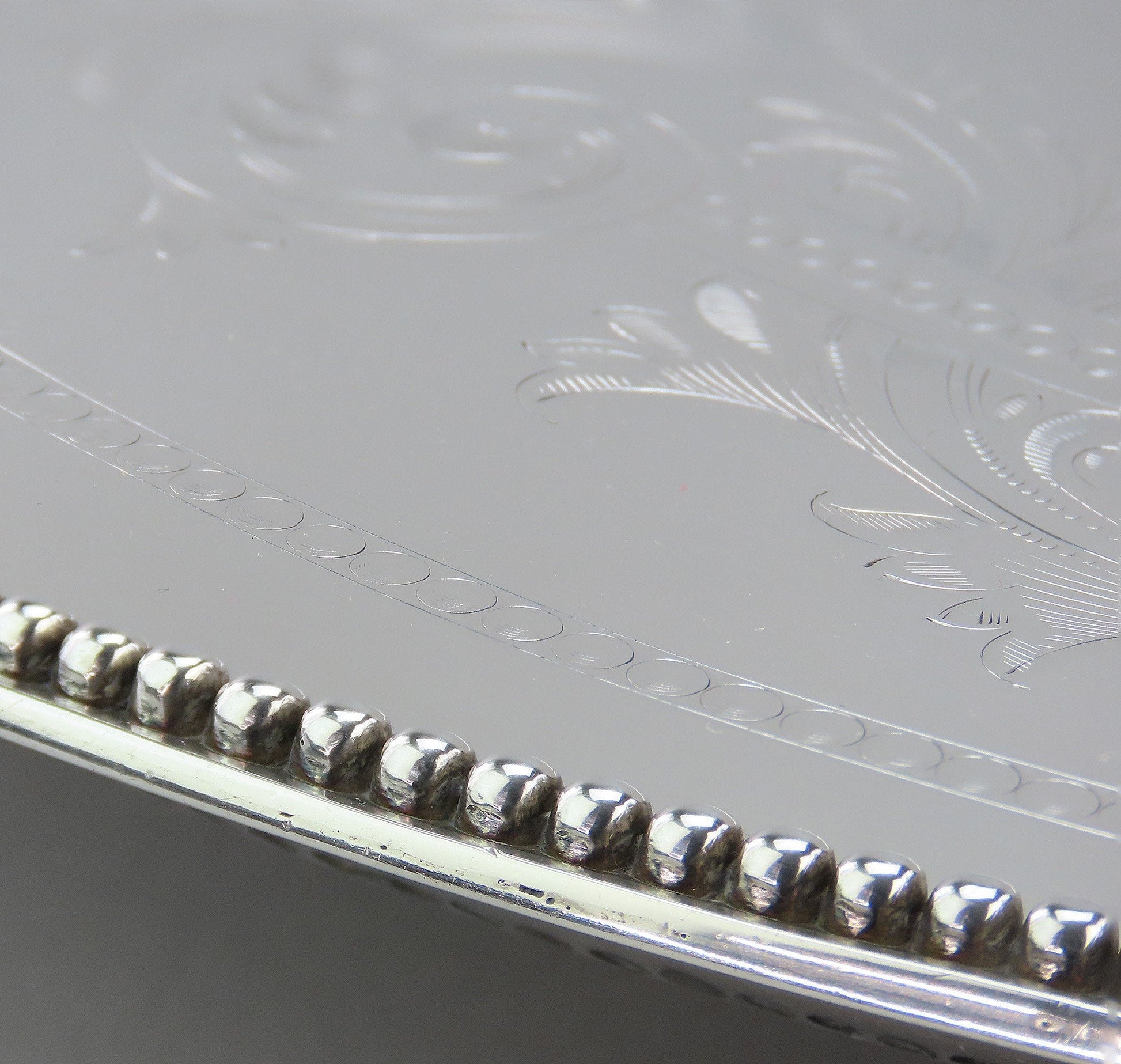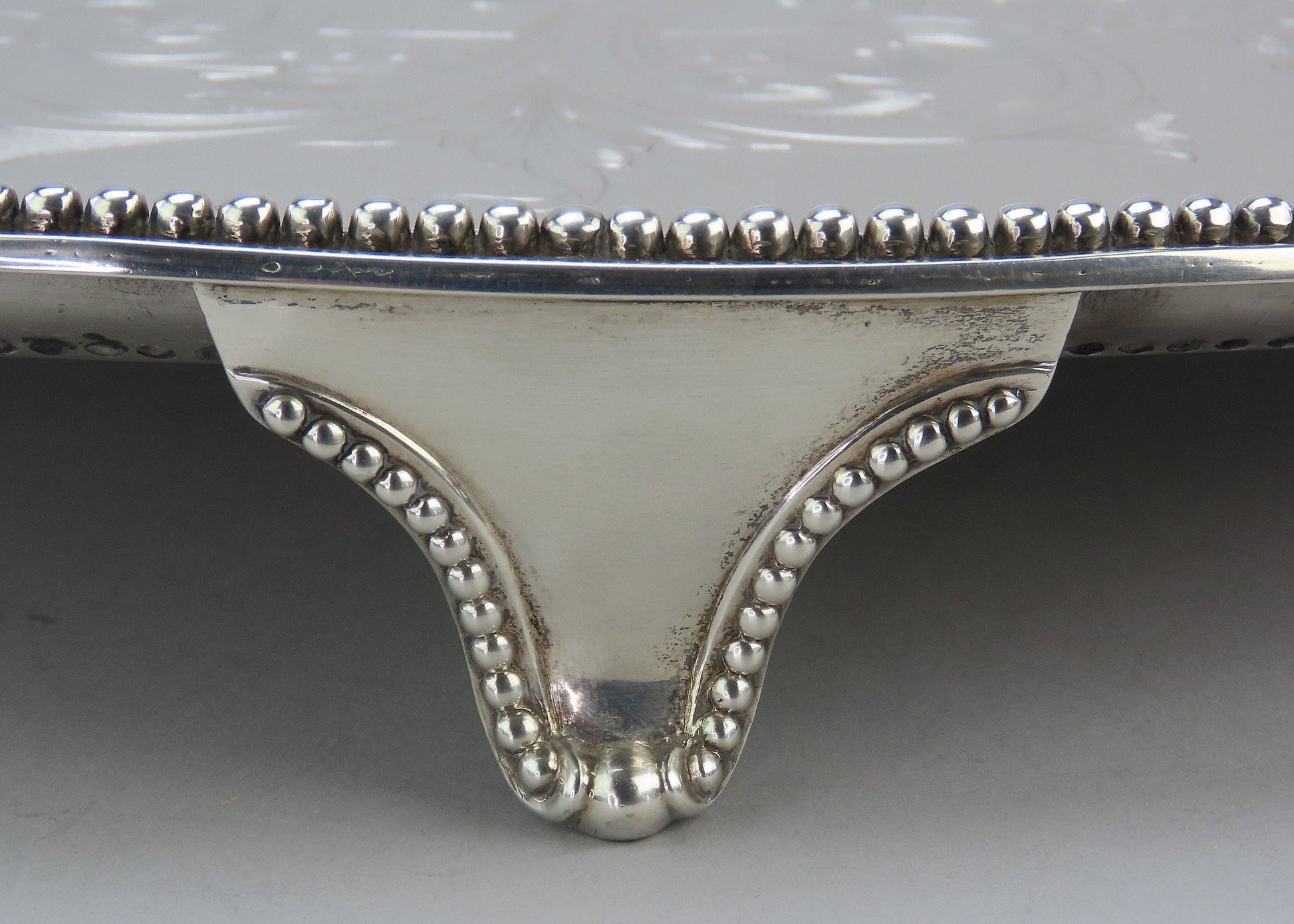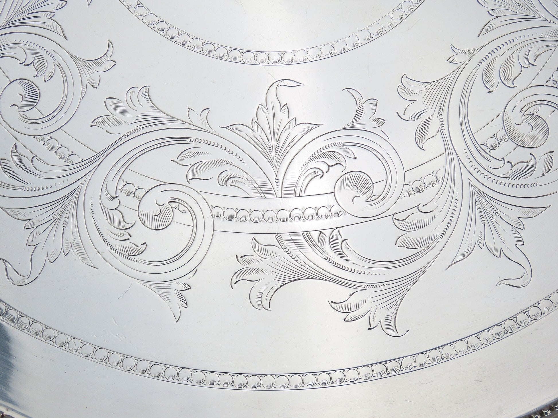 Presented is an excellent English Georgian sterling silver large serving tray, dated 1781. The tray is round and stands on four scroll form feet. The tray has a wide, continuous band of finely hand engraved decoration, in the form of foliate scrollwork entwining and between beadwork bands, all richly detailed and well done. The engraved beadwork decoration matches a raised beadwork border around the rim, the interior, and the feet of the tray. The center of the tray has a crest of a spur and leather between raised wings, associated with the Beeching, Annandale, and Capp family names, likely others as well. The tray is a good large size, likely able to accommodate a tea service of four pieces or more with ease, depending on the set's size of course. A very impressive piece.