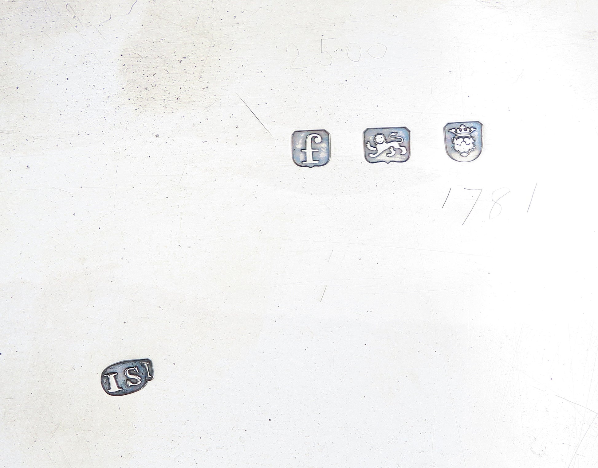 This piece is hallmarked with the lion passant for sterling silver, the leopard's head crowned for the city of London, the date letter f for 1781, and a maker's mark likely for Joseph Steward or Joseph Steward II.