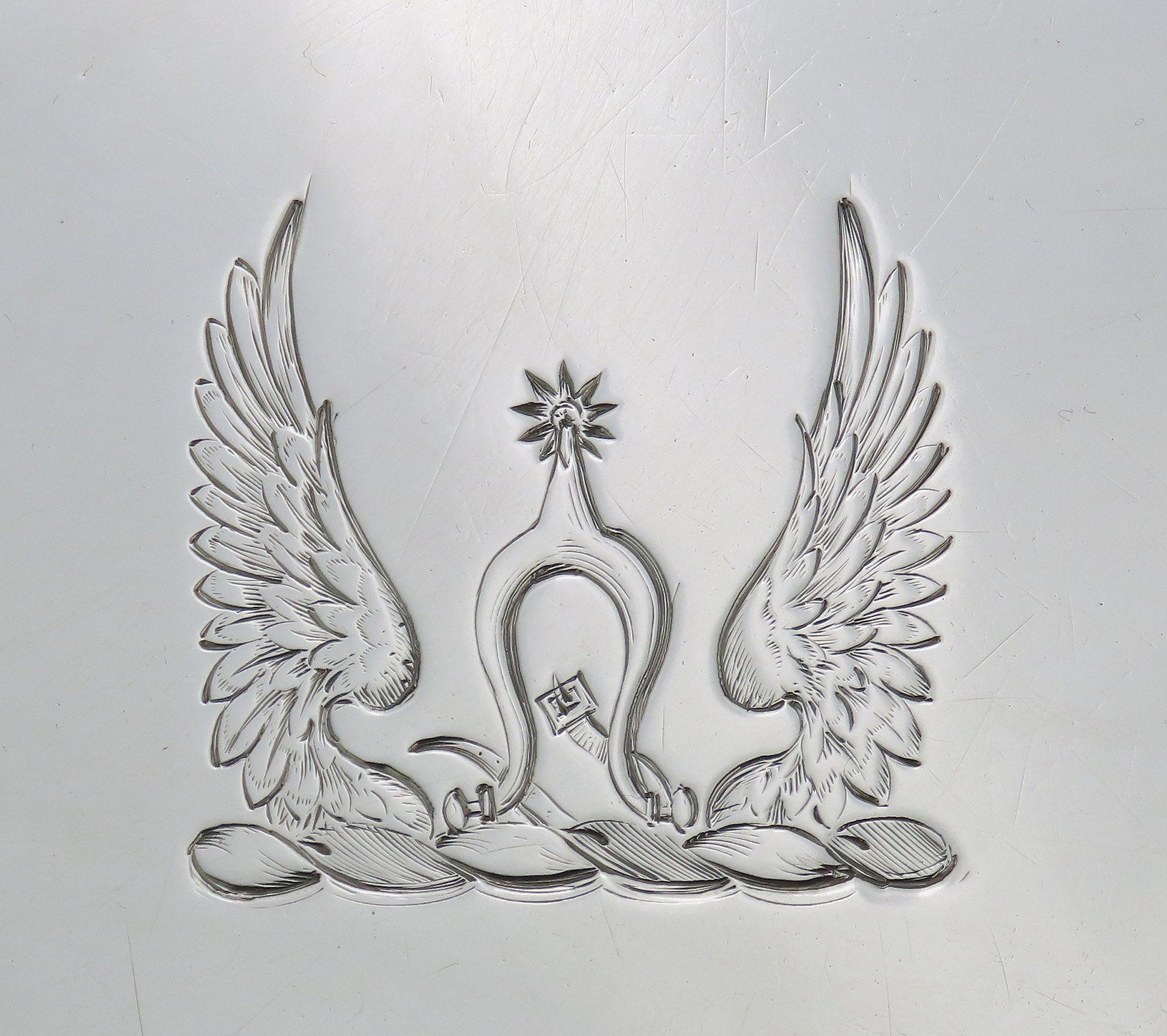 This piece is in great condition. The crest and the engraved decoration are quite crisp. There are no splits, no dents, no breaks, no monogram removals, and no repairs.