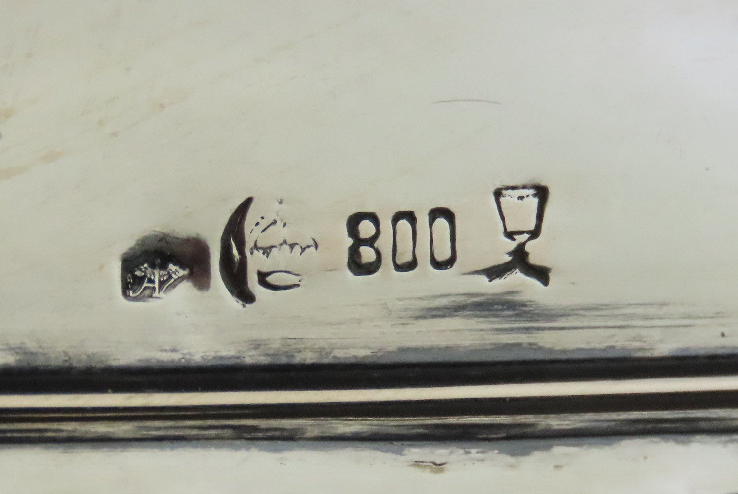 The underside of the piece is stamped with the German crescent moon and crown with 800 for the purity of the silver, an Austrian import mark, and a maker's mark likely for Koch & Bergfeld.