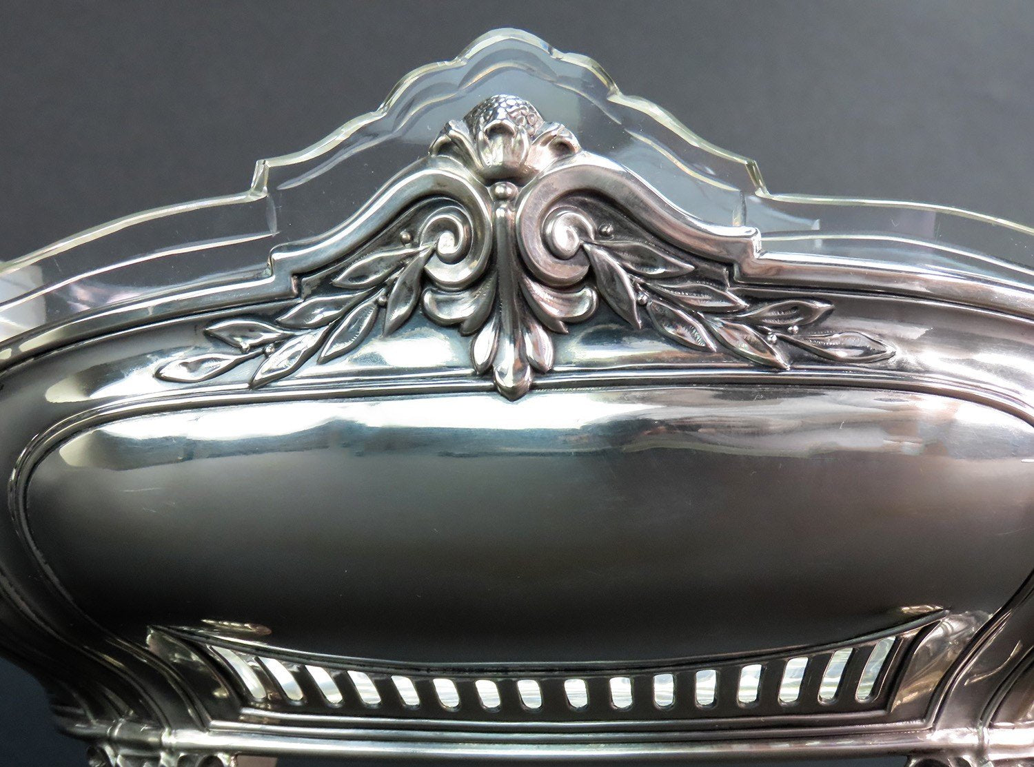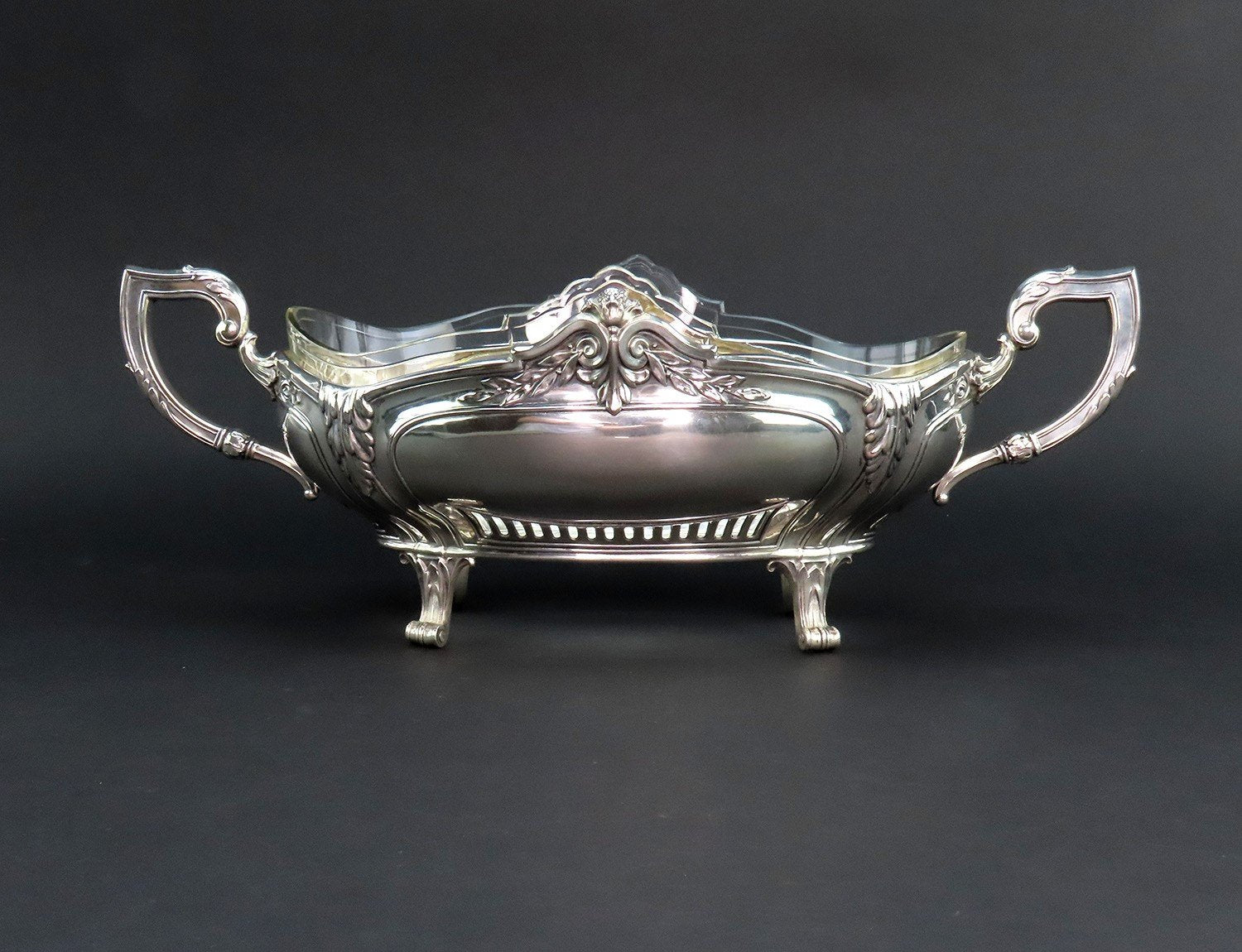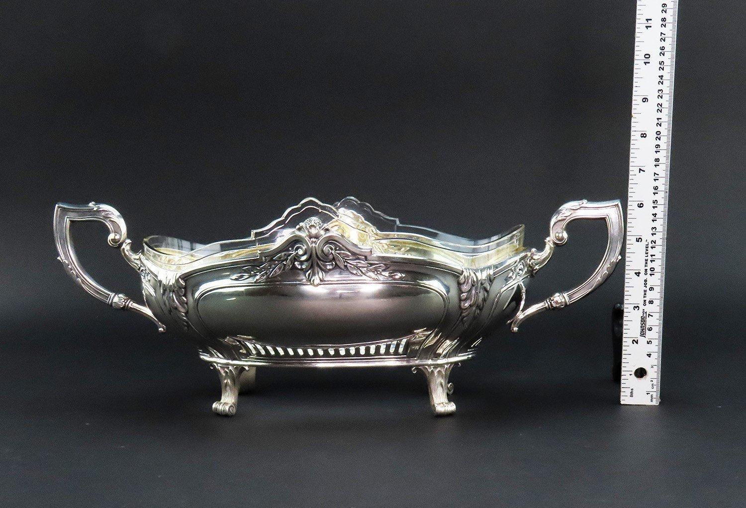 Presented is a stunning antique German 800 purity silver glass lined centerpiece bowl, dating to the late 1800s or early 1900s. The silver portion is very well made, with elegant openwork decoration on the lower body, bold acanthus leaf and laurel-draped scrolls around the sides, and four scroll form feet. The bowl has a handle at either end, done in a handsome neo-classical style. The glass liner is all original and conforms to the shape of the bowl but is removable for ease of cleaning. A very impressive piece with real presence.