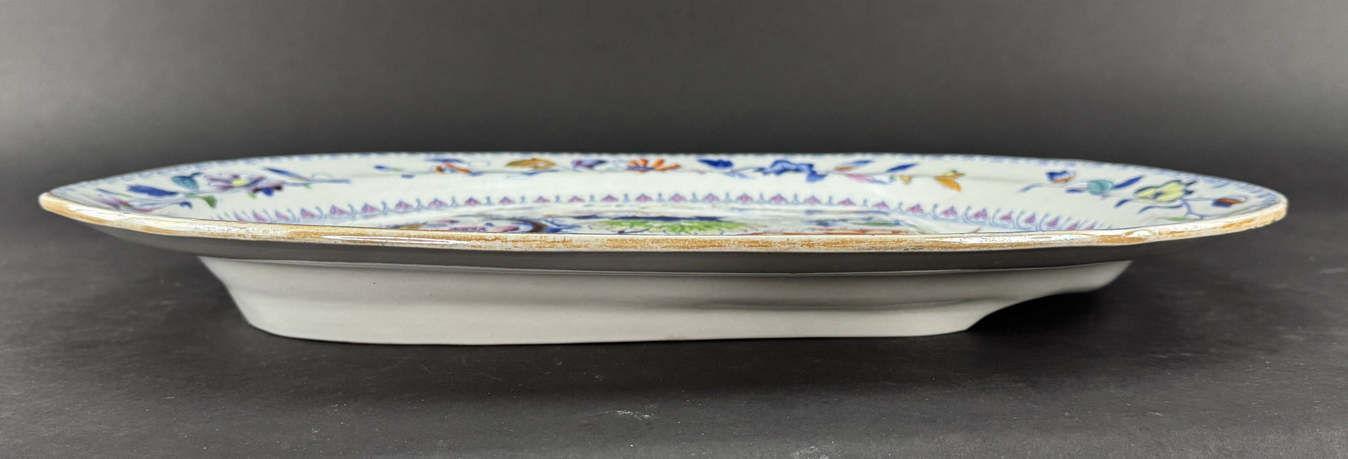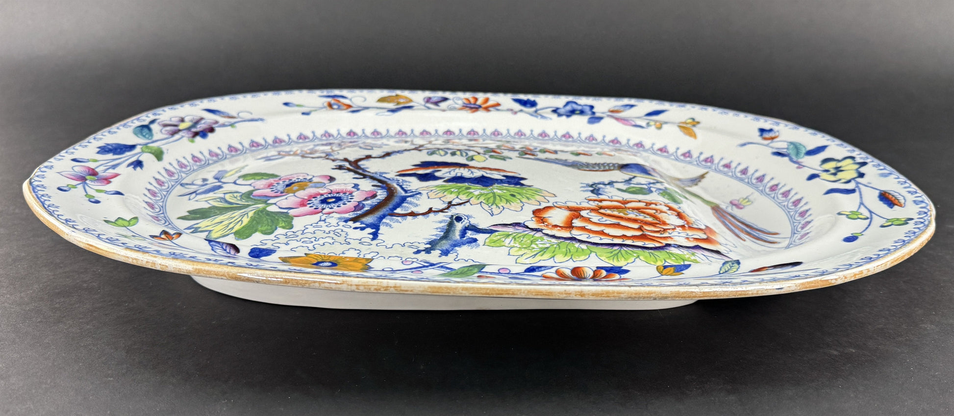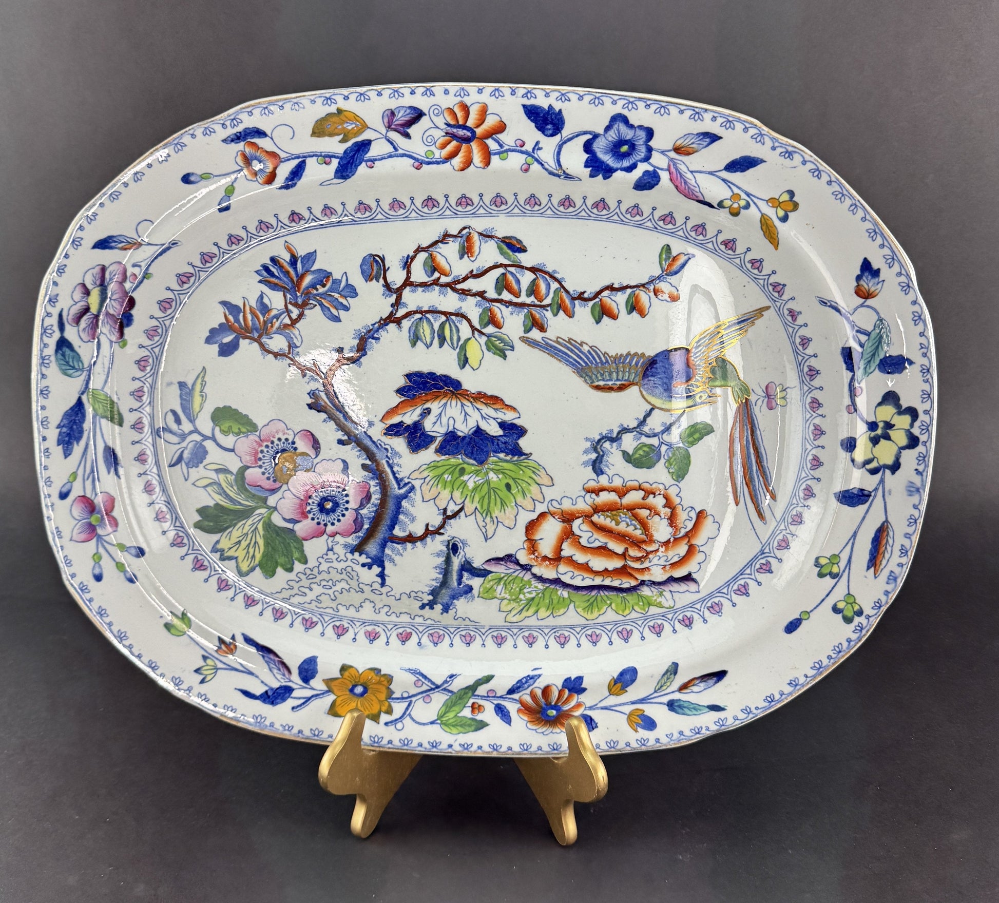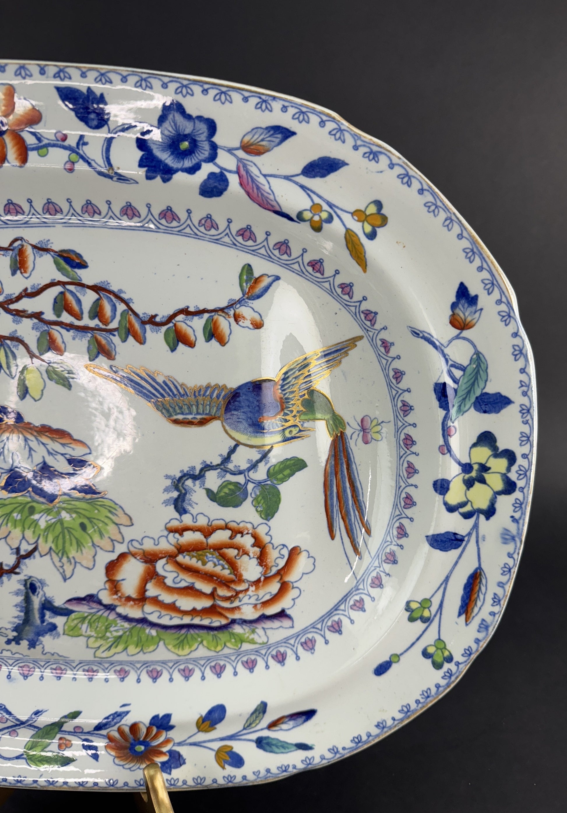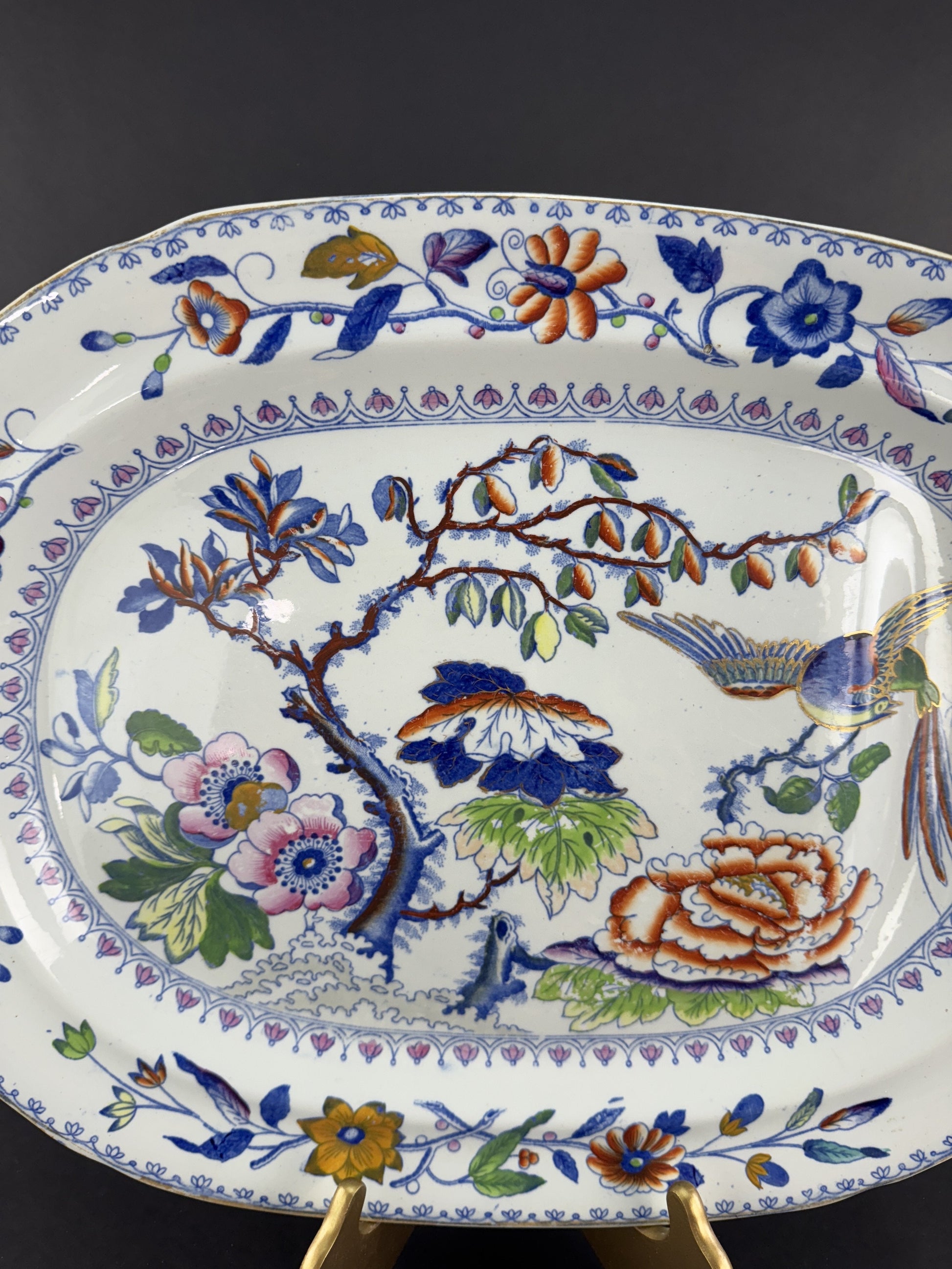 Presented is an excellent quality antique Davenport stone china meat serving platter, dating to circa 1810-1815. This platter is made in the highly sought after Flying Bird pattern, which is a vibrant and colorful Chinoiserie pattern depicting a long tailed bird in flight surrounded by stunning flowers and foliage. The palette is a very eye-catching array of blues, greens, orange, purple and pink shades, with fine gold gilt detailing. This pattern would later be produced by Mason's Ironstone as well as other fine English makers. This is quite a large size serving platter complete with a “well” at one end to catch drippings, easily able to accommodate a roast or even a Thanksgiving turkey. We have many additional pieces in this pattern from the same estate including some particularly rare examples, which you can find by searching “Flying Bird” in our store.