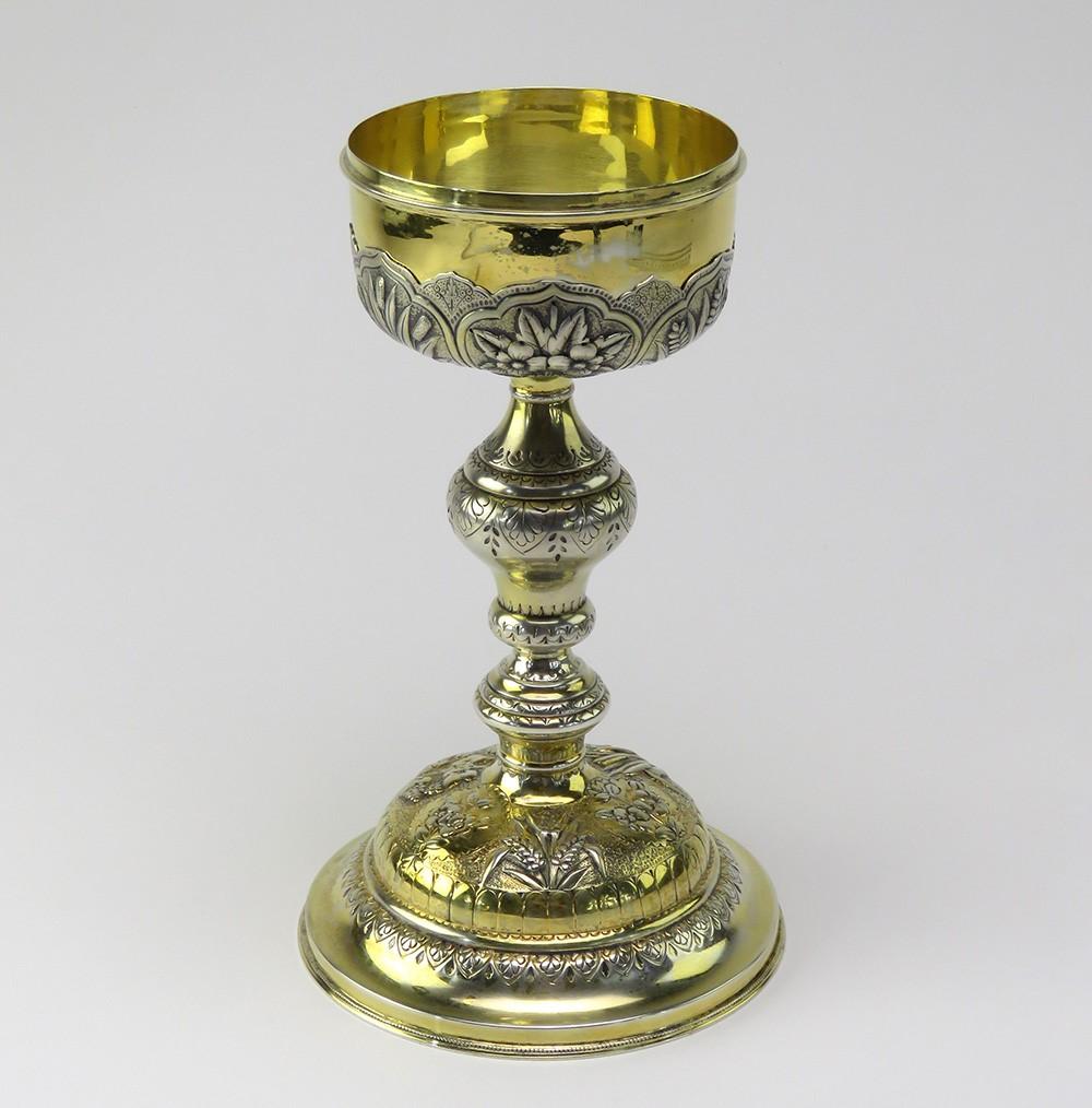 Though this piece may have started life as a ciborium, based on the lip around the rim, it does not have a lid now, but it is perfectly useable as a chalice, cup or goblet.