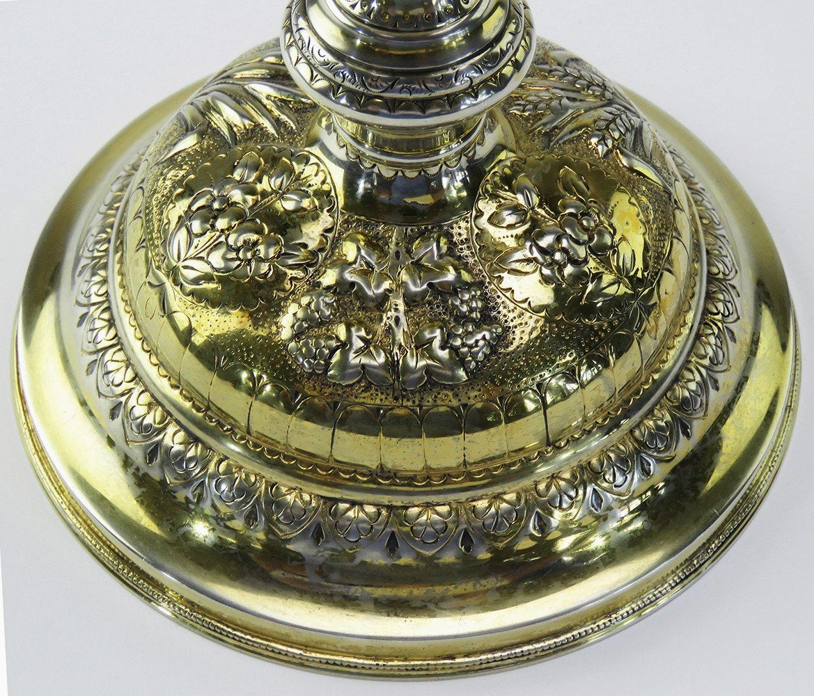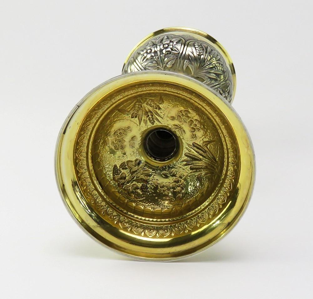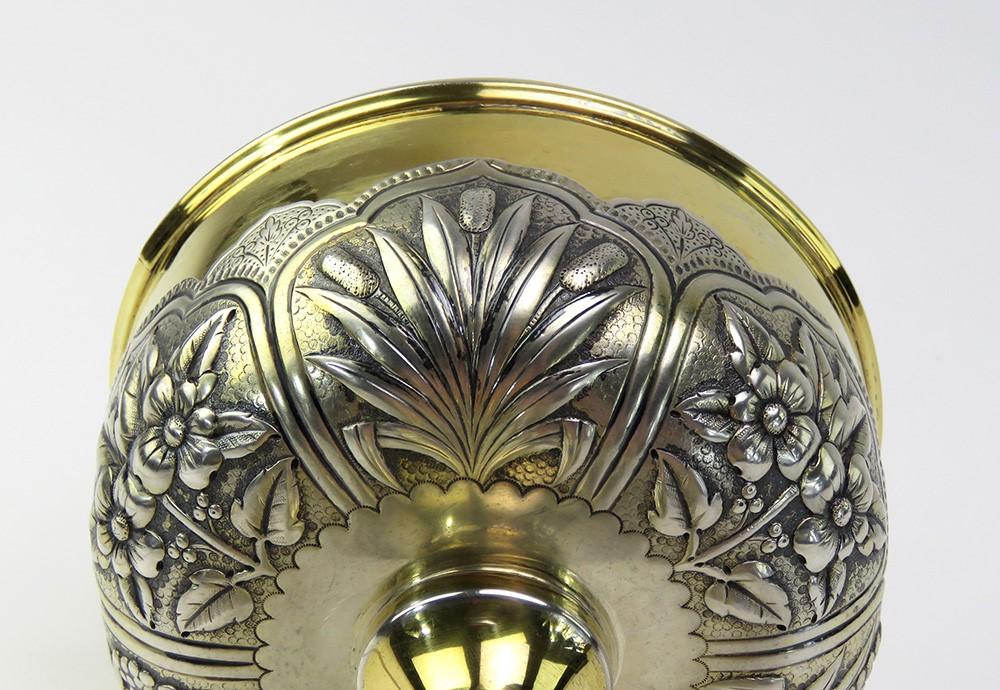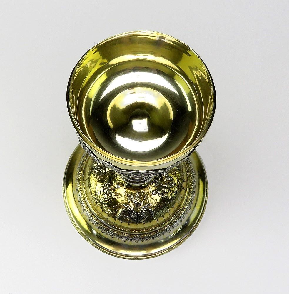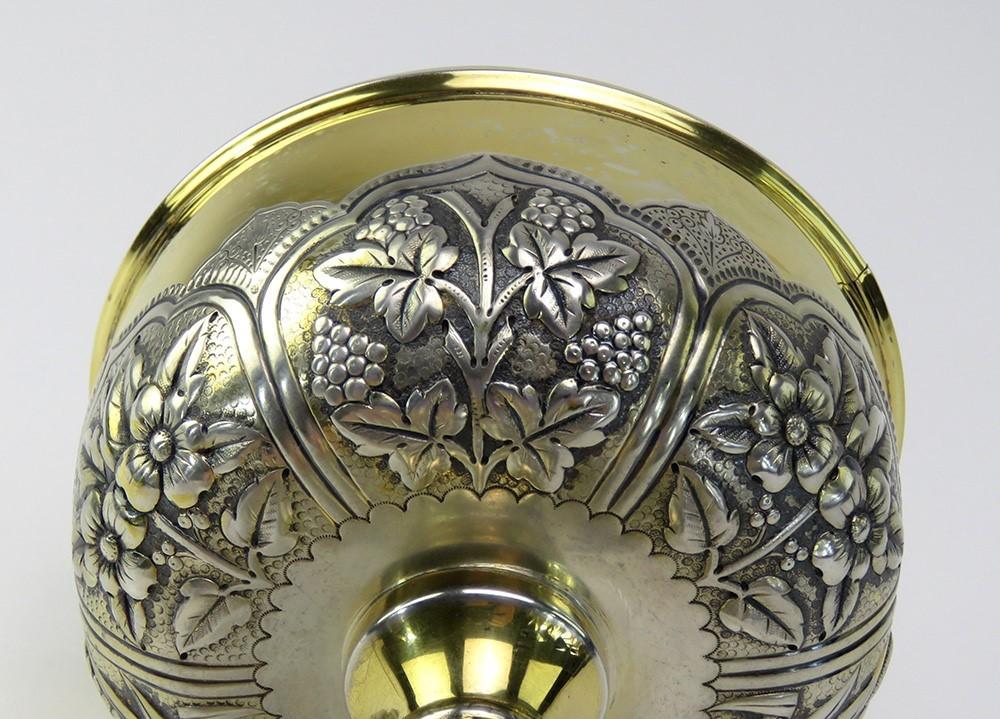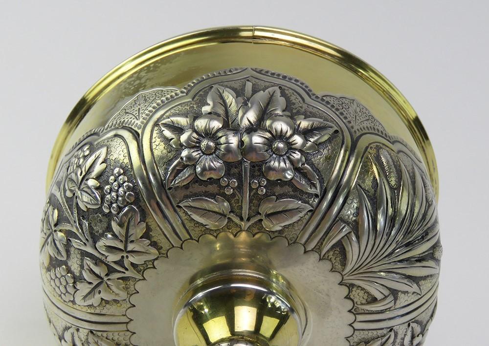 This piece is in great overall condition. The details of the chasing are nice and crisp. There is some wear to the gilding, most notably on the shaft, but the gold wash of the interior of the cup portion is in very good shape. There are traces of a lacquer around the base and the side of the cup portion, this piece would benefit from being professionally cleaned on a polishing wheel, but we leave this to the buyer. No splits, no dents, no monograms, no monogram removals, and no repairs.
