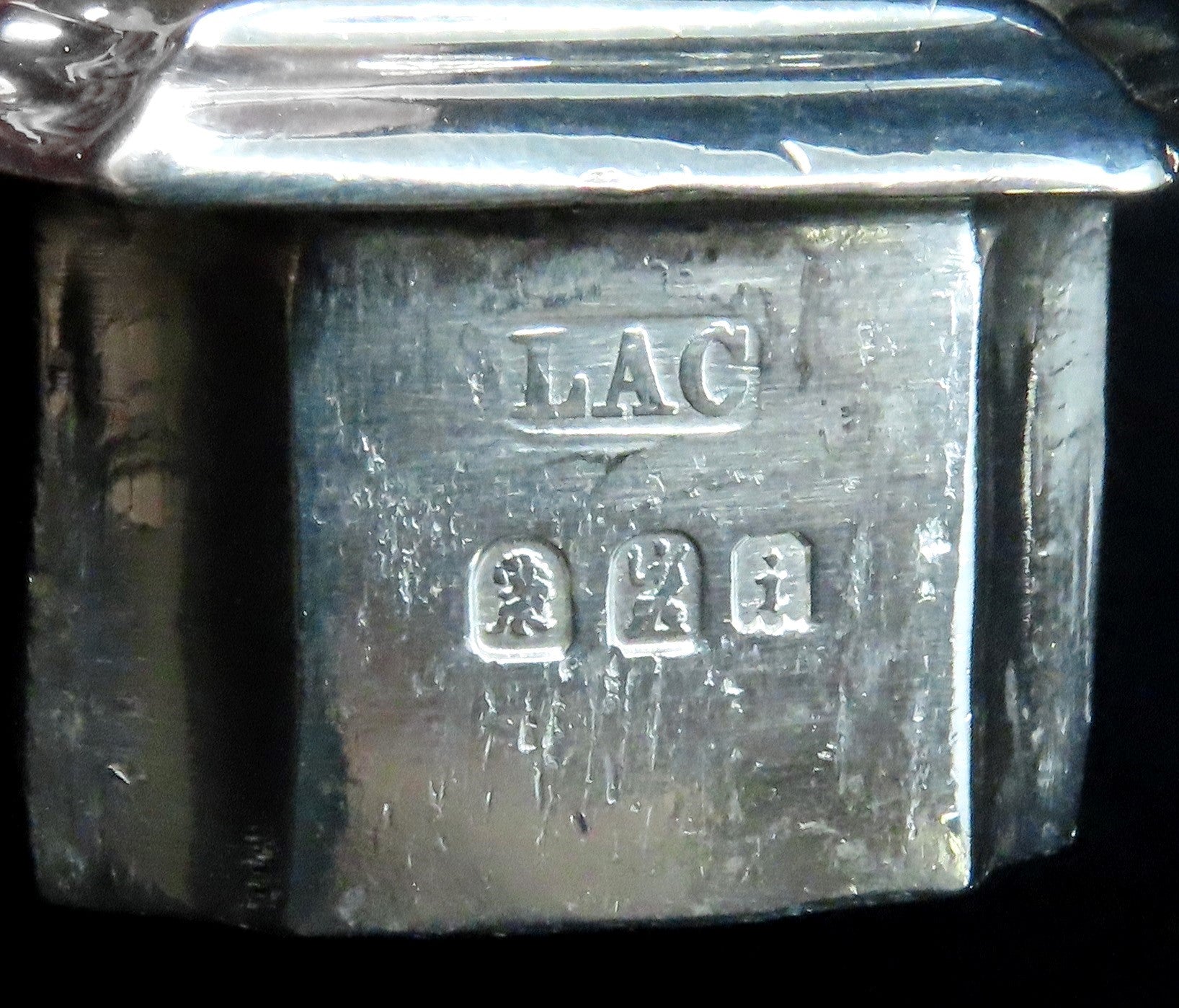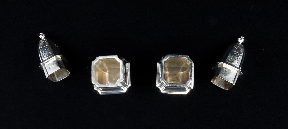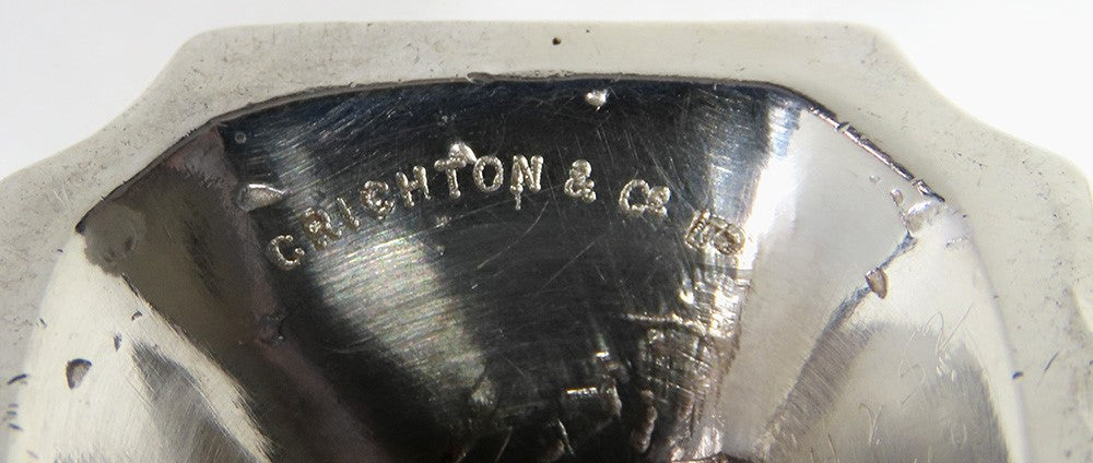 Each shaker is hallmarked with the seated Britannia mark for 958 purity silver, the lion's head erased for the city of London, the date letter I for 1924, and the maker's mark for Crichton Bros. These marks also appear on the lip of the lid, which we show in the photographs. The undersides are also marked Crichton & Co and Made in England.