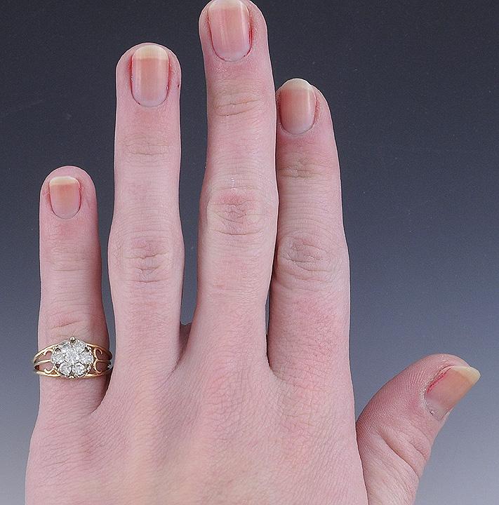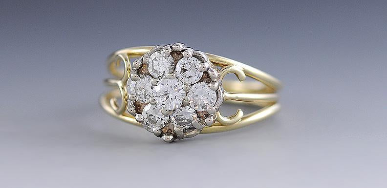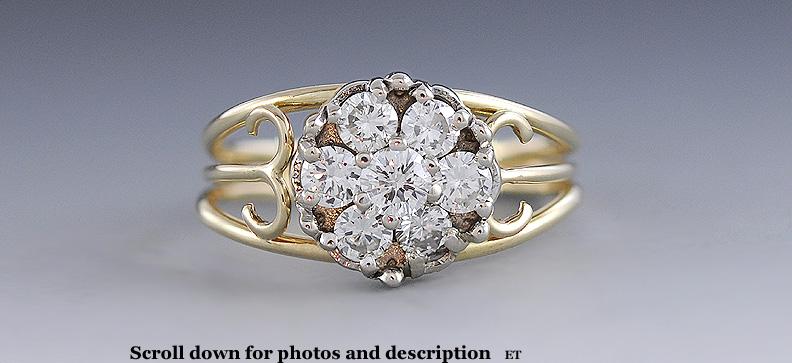 with 7 modern brilliant cut diamonds arranged in a floral cluster type design,