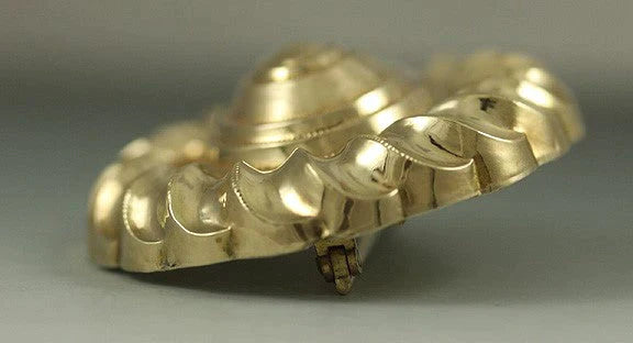 Presented is an attractive, Victorian 14 karat yellow gold brooch or pin made during the 1830s-60s. The pin is in an interesting form, with a raised bullseye center and a scalloped or ruffled edge. The pin has an old C-style clasp.