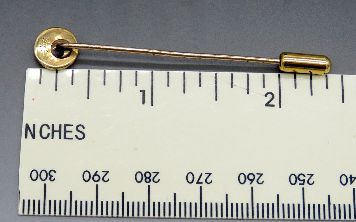 The head of the stick pin is 14 karat gold, nitric acid tested and guaranteed. The shaft tests as 10 karat gold, not uncommon in stick pins.