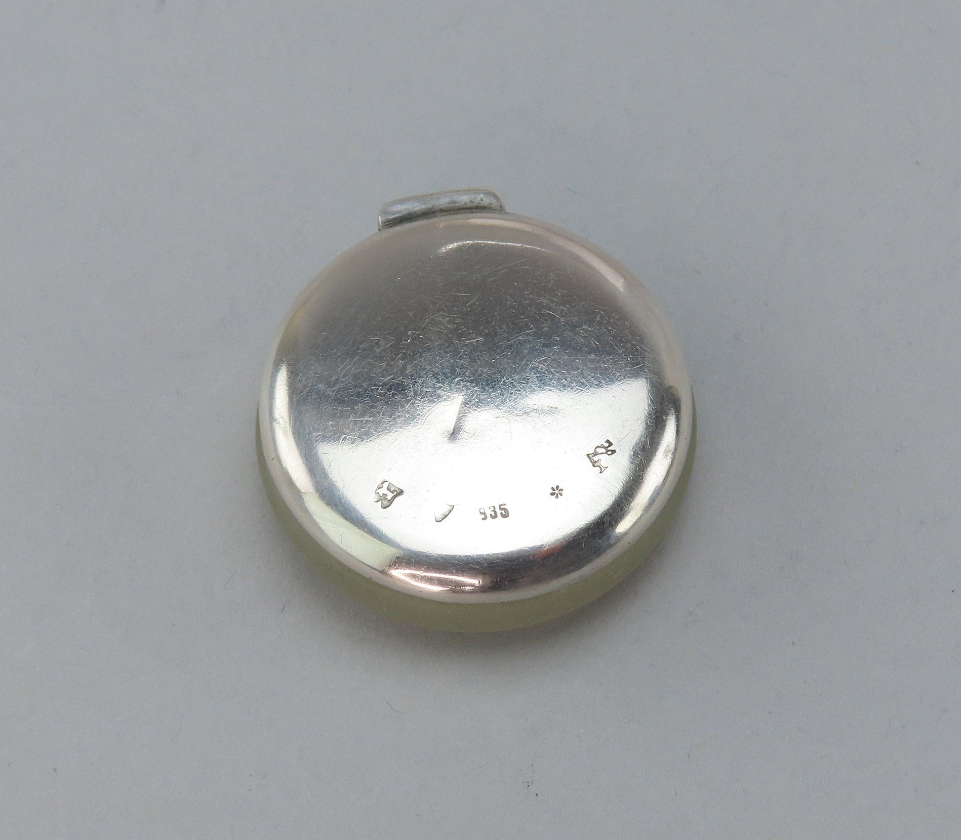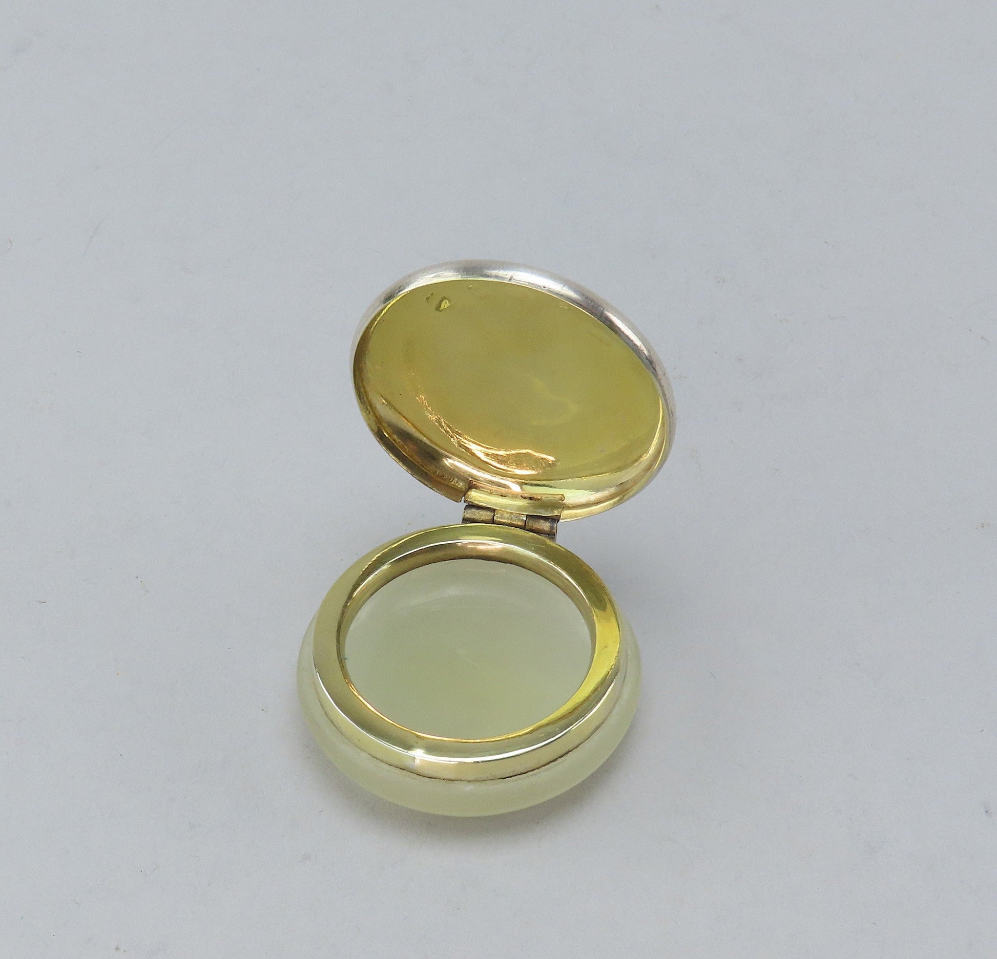 Presented is an interesting antique silver and stone pill box, snuff box, or trinket box. This piece is of continental European origin, possibly Scandinavian, and dates to circa 1900. The lid and rim of the box is 935 silver (a higher standard than sterling 925) while the rest of the box is a faintly translucent yellow-white polished stone. The inside of the lid has a gold wash.