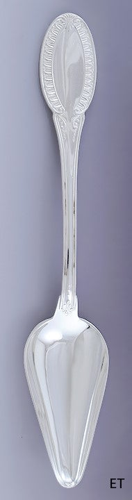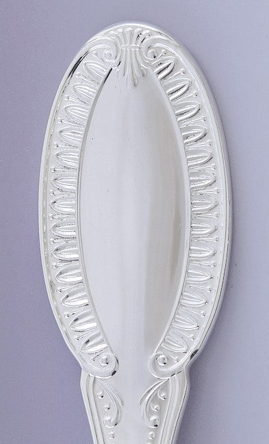 Presented is a fabulous Italian 800 silver serving spoon. This is a relatively modern piece, made in the past 30 years or so. The server is done in a pattern that looks identical to the Imperial Crown pattern by Buccellati, with a classical egg and dart design around the handle. The serving spoon has a distinctive bowl, wide at the back but steeply tapering to the front, closer to triangular than is usually seen on spoons.