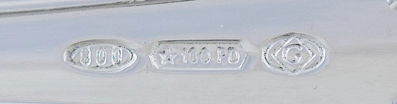 The server is stamped on the stem with 800 for the purity of the silver, as well as an Italian government registered maker's mark of 100 next to PD, the abbreviation for Padova (Padua). There is also a maker's mark of G inside a diamond, which we unfortunately do not recognize.