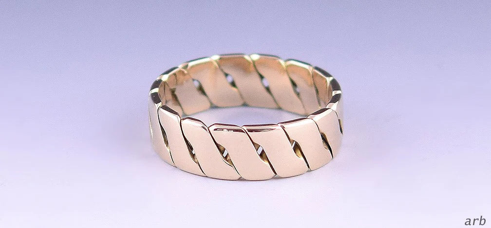 This ring features a band which is made up of abstract “S” shaped pieces.