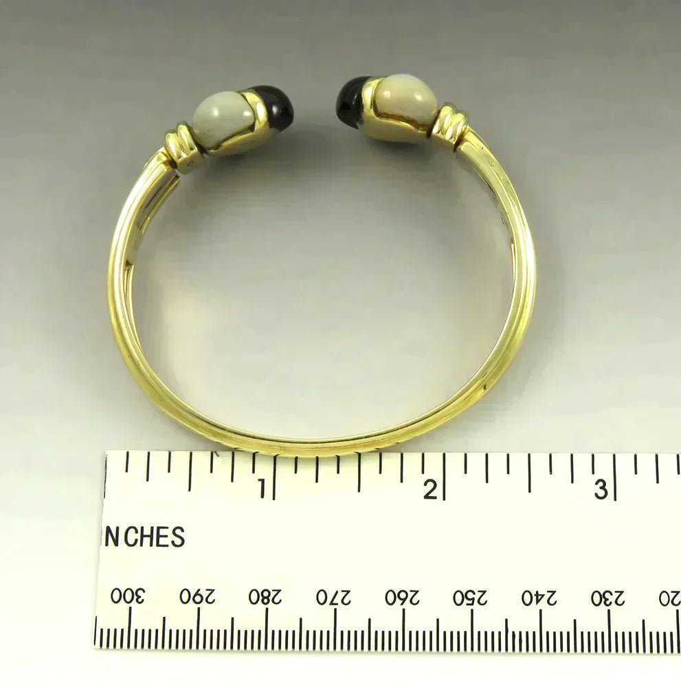 Italian 18K Gold Mother of Pearl Shell Onyx Gemstone Heavy Bangle Bracelet 46.2g