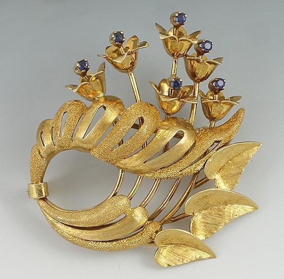 Presented is a stunning 18 karat yellow gold pin and earrings set made in Italy during the 1950s or 60s. All of the pieces have a wonderful brushed finish and the pin also has pebbled pieces of gold to add texture to the piece. The earrings originally had post backs for pierced ears, but they have been converted with gold screw backs. The earrings have two bell flower blossoms set with sapphires and the pin has lovely open flowers set in the middle with sapphires. The sapphires are all set very well into their prongs. This is a skillfully constructed set of fine quality. The pin measures 2 5/8 inches wide, each earring measures 1 1/4 inches long and the combined weight of the set is 18.6 grams.