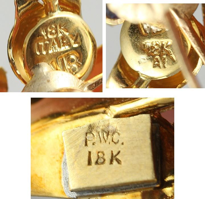 All three pieces are marked Italy and 18K. The screwback mechanisms are 14 karat gold. Everything else is 18 karat gold.