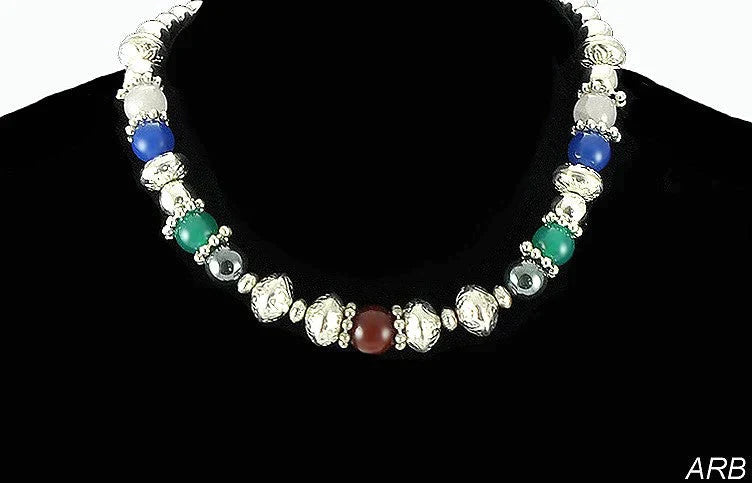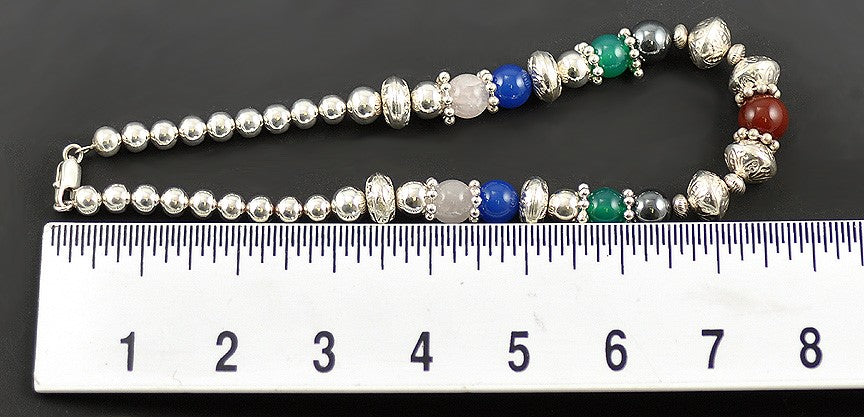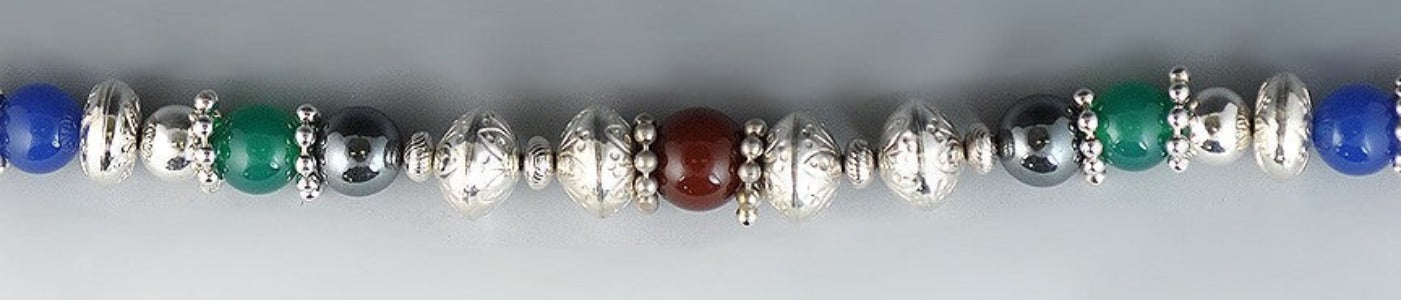 necklace. It marries sterling silver beads with multi-colored stone beads.