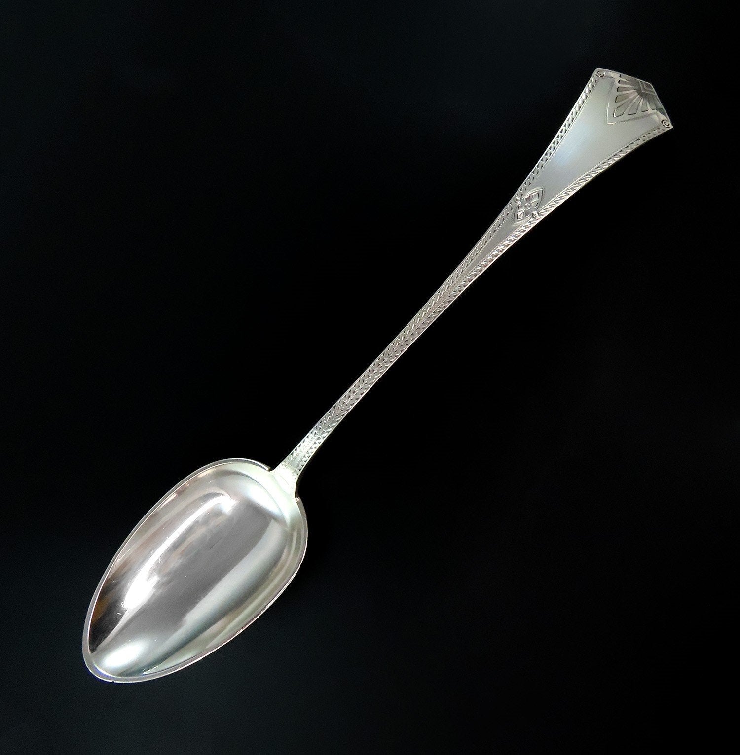 Presented is a handsome large antique sterling silver platter or casserole spoon from the 1860-1870s. This piece displays fancy bright cut engravings along the front of the handle. The back of the handle has a notch that keeps the spoon from slipping in the bowl or tray.