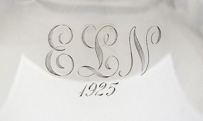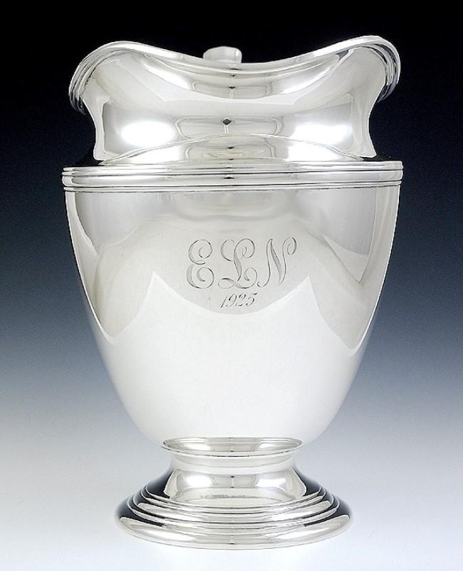 Presented is a wonderful sterling silver pitcher made by International Silver Co. This pitcher dates to circa 1925. The pitcher is done in a very classical form. The pitcher is raised on a pedestal base. The front of the pitcher, underneath the pouring lip, is monogrammed with 'ELN' in large, elegant script. Beneath this is the year '1925' in smaller but matching script. This piece is very well constructed from thick silver throughout. The interior is very clean, ready for use.