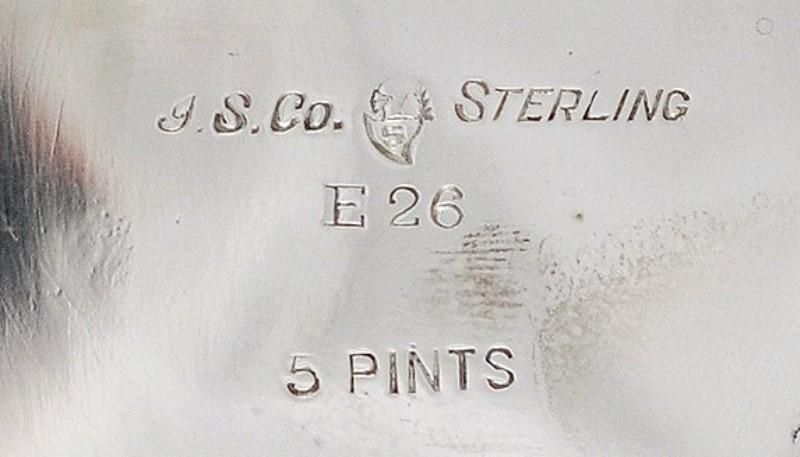 This piece is hallmarked on the underside with the maker's mark for the International Silver Co., the word 'sterling' and the capacity of the pitcher, which is 5 pints.