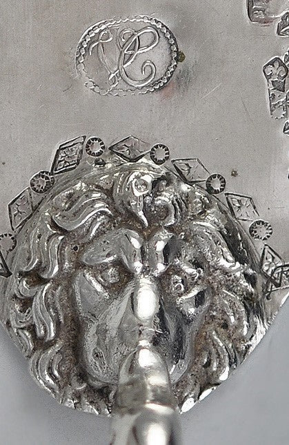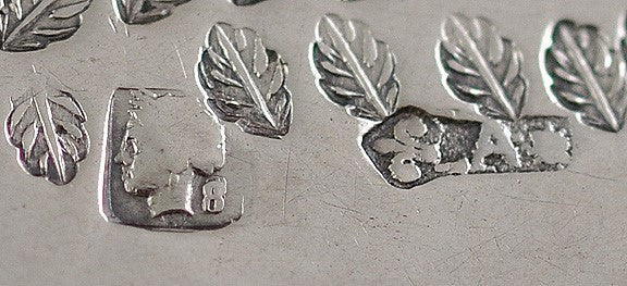 The fish slice is marked on the blade with a government mark of a head in profile with an 8 or B to the lower right, and a fleur-de-lis next to an A and star or sun. There is also a large mark of the initials VC in cursive script in a beaded border. We are not able to identify these.