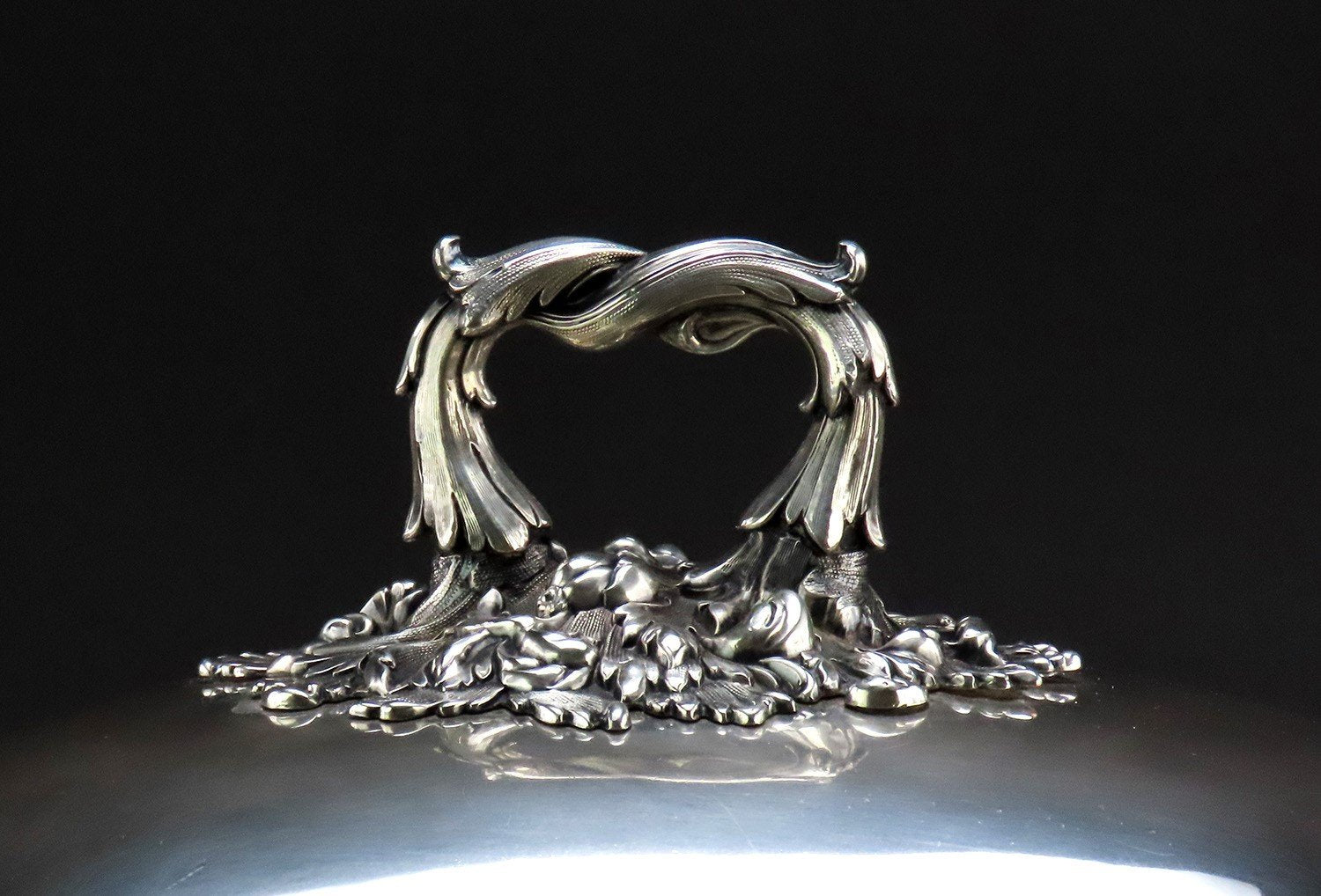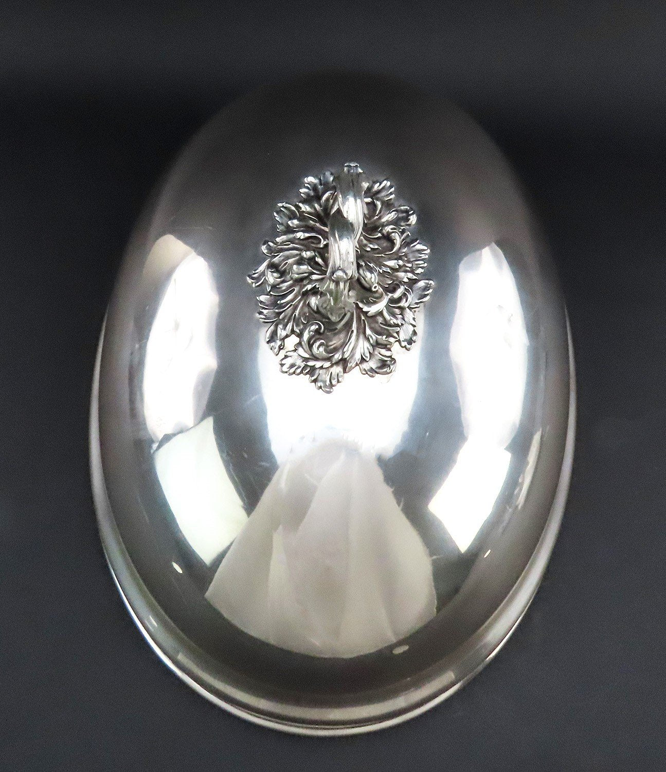 Presented is an excellent quality English Sheffield fused silverplate serving dome or cloche. This piece was made by Roberts, Cadman & Co and dates to circa 1790-1820. The dome is made in a classic oval form with a high, impressive silhouette. The handle is separately cast, in the form of two interwoven foliate vines with profuse and richly detailed acanthus leaf flourishes at the base. The interior of the bell is tinned, and the rolled over silver edge is visible around the rim. One side of the exterior has a well done sterling silver inset, perfect for a monogram or inscription, which has never been engraved.