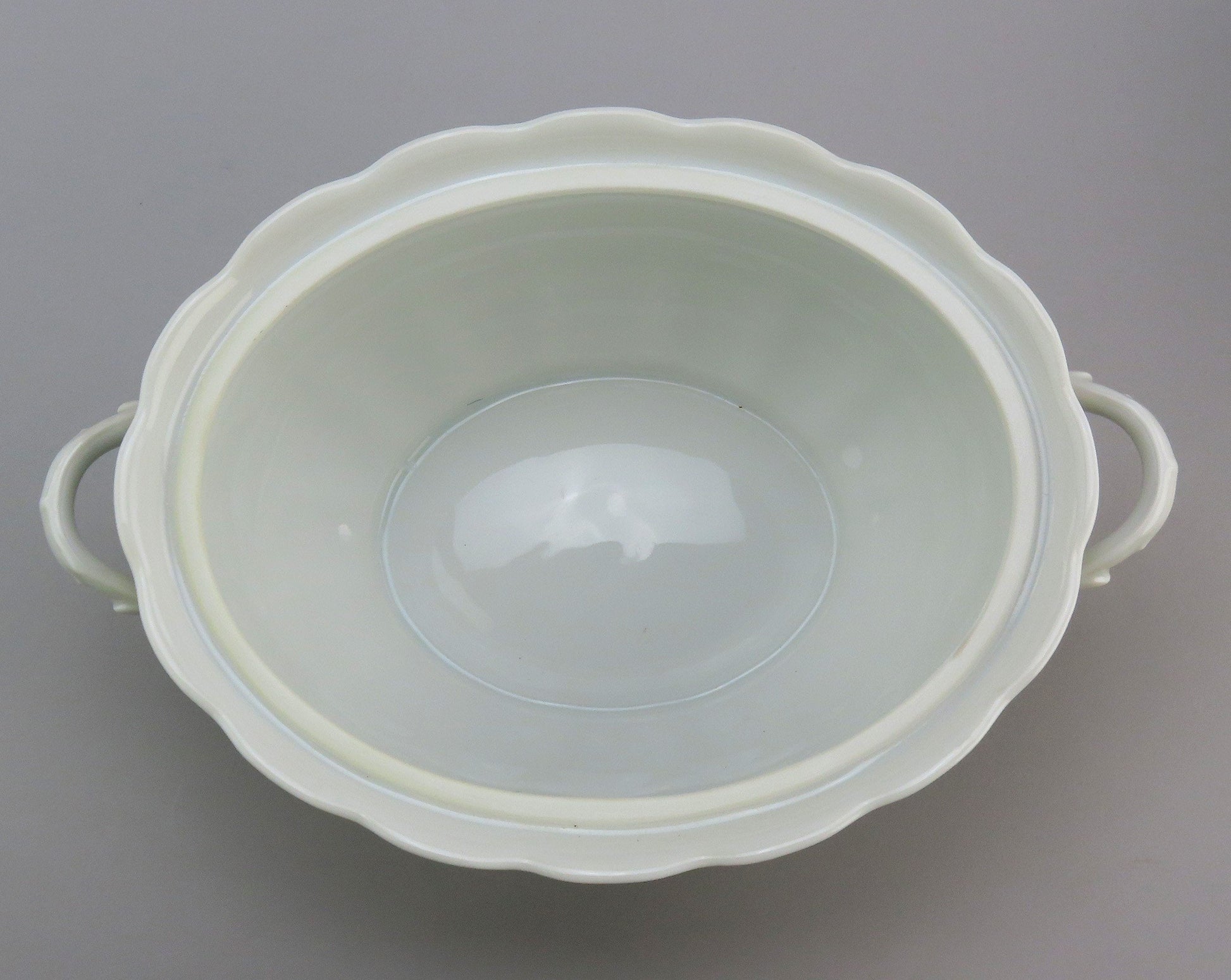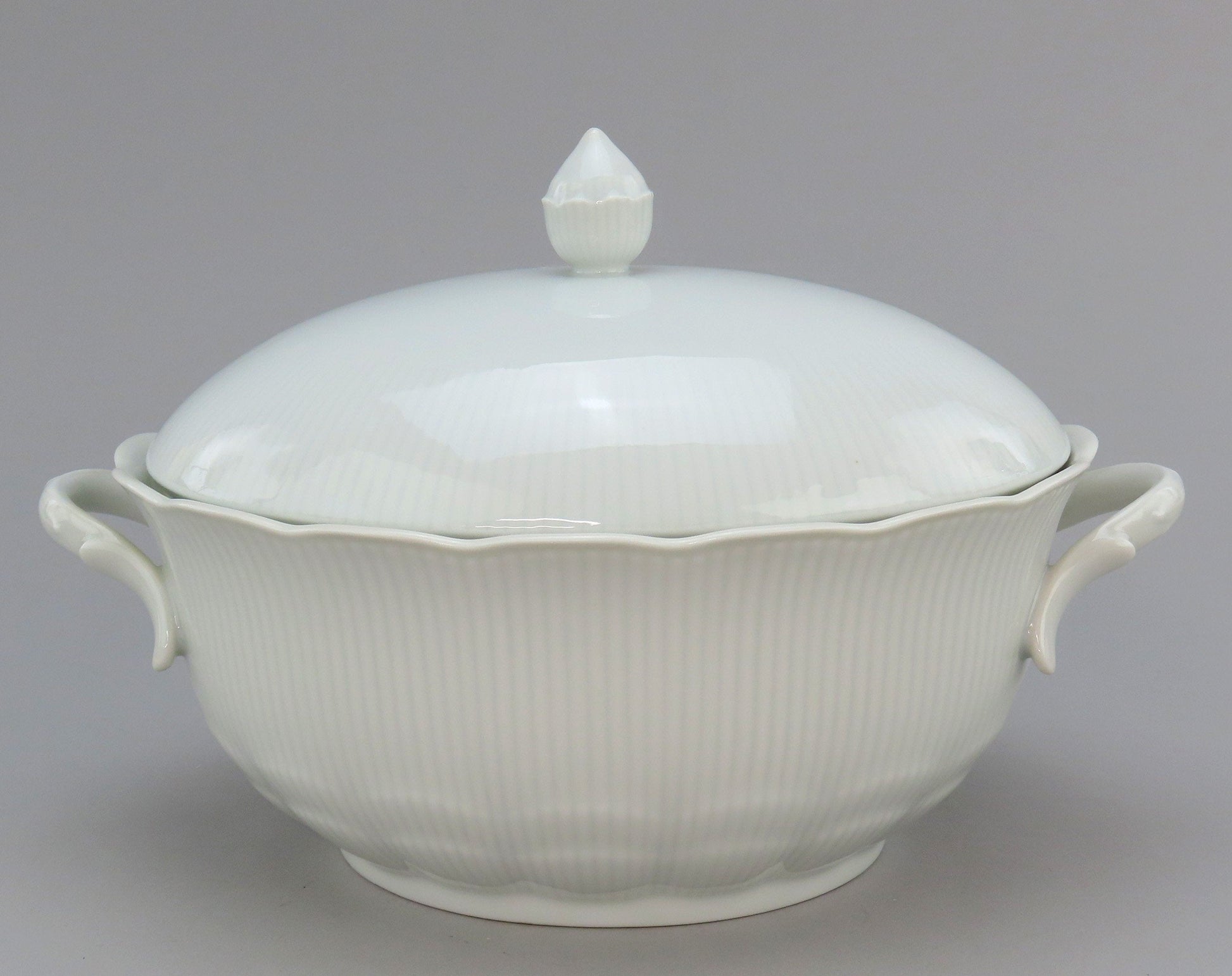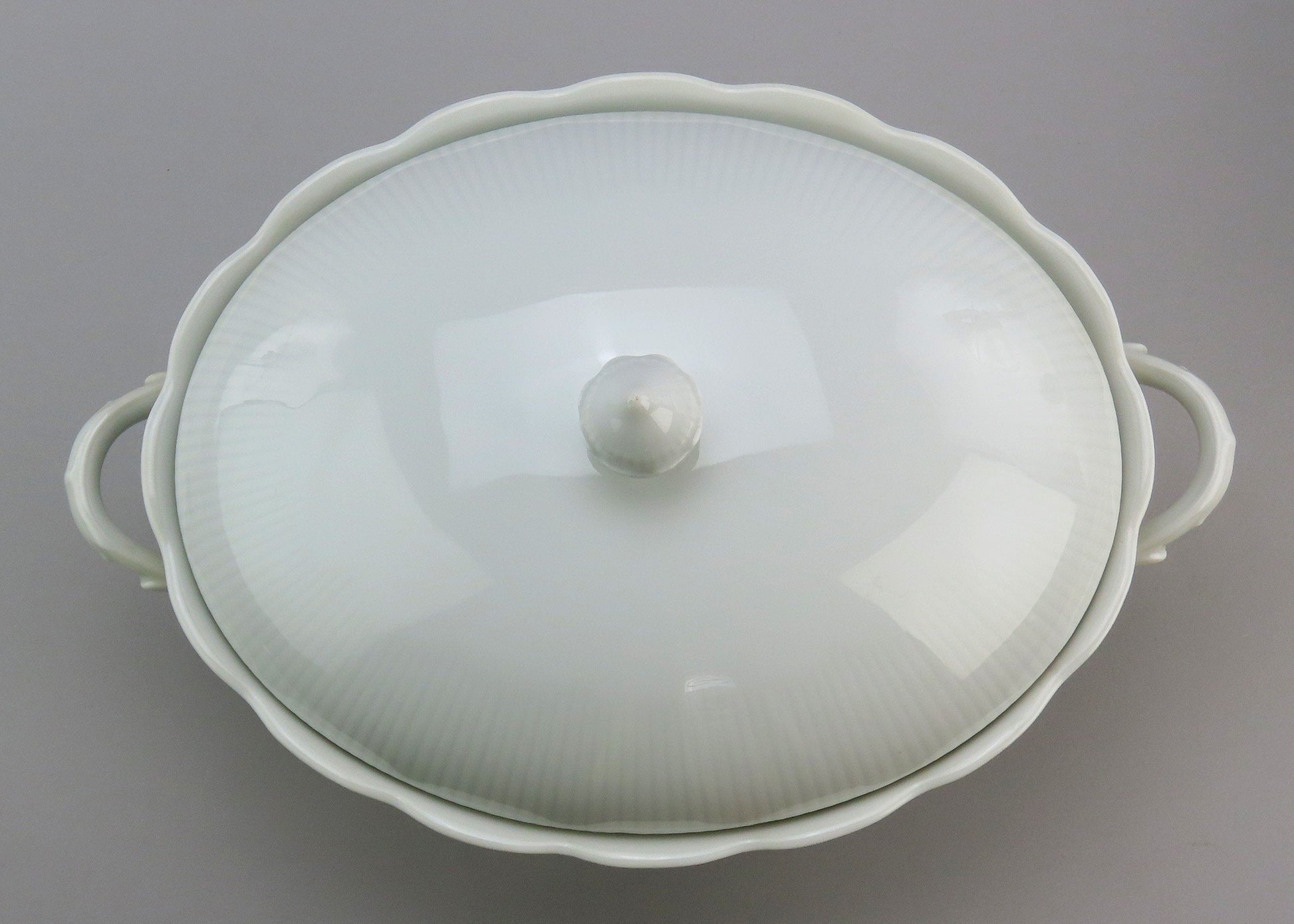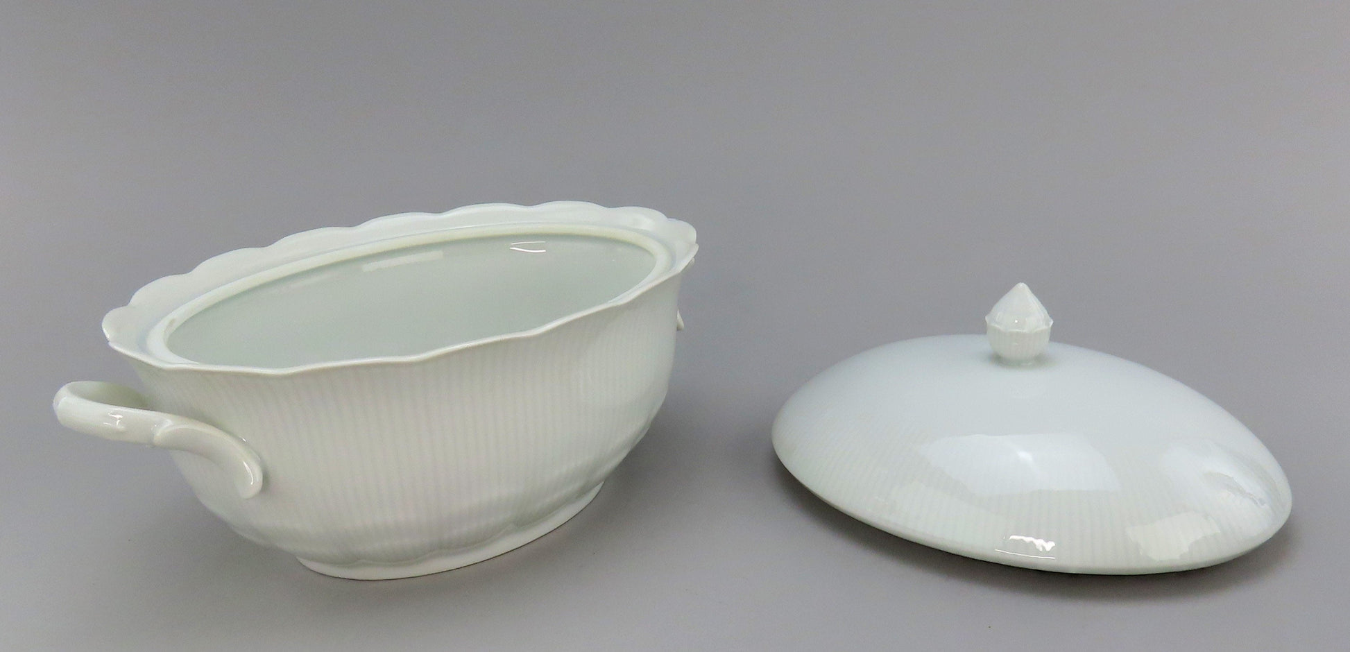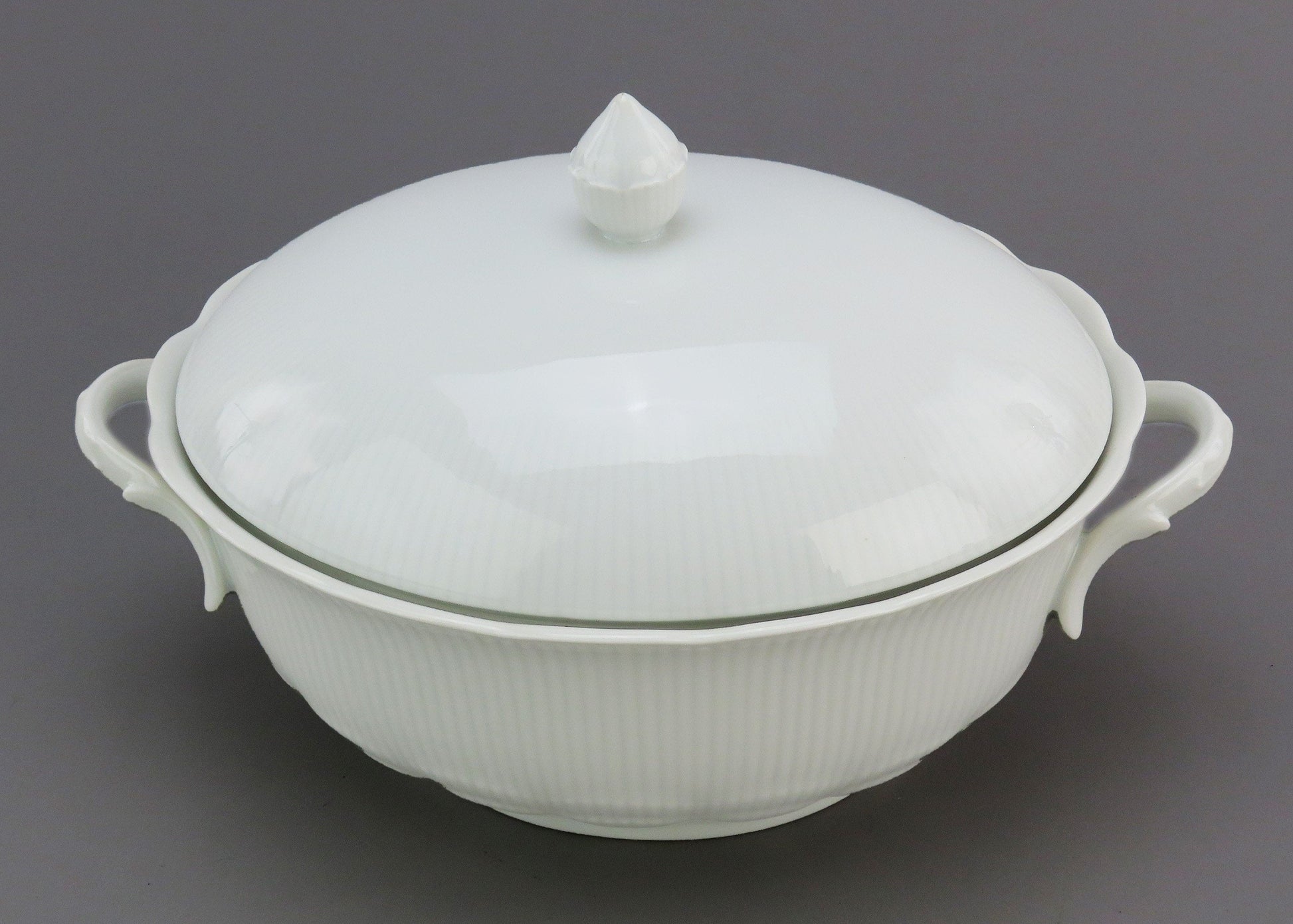 Presented is a porcelain oval covered vegetable or serving dish from Kaiser. This piece is in the Romantica pattern, which was produced between 1988-2004. This pattern displays a scalloped edge with subtle vertical ribbing decorations around the piece and the border of the lid. There is a nice finial on top and handles on either side.