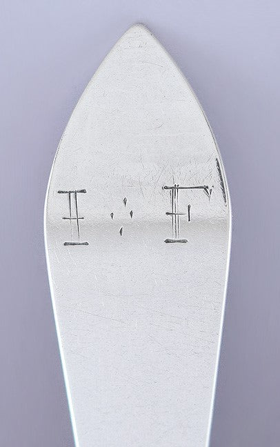 Each spoon is stamped on the back of the stem with J. Clark. We think this may be for Joseph Clark, a Portsmouth, New Hampshire silversmith active circa 1790-1811. The mark is not an exact match for the example of his mark shown, although it is very close, and we are not certain that this is the maker.