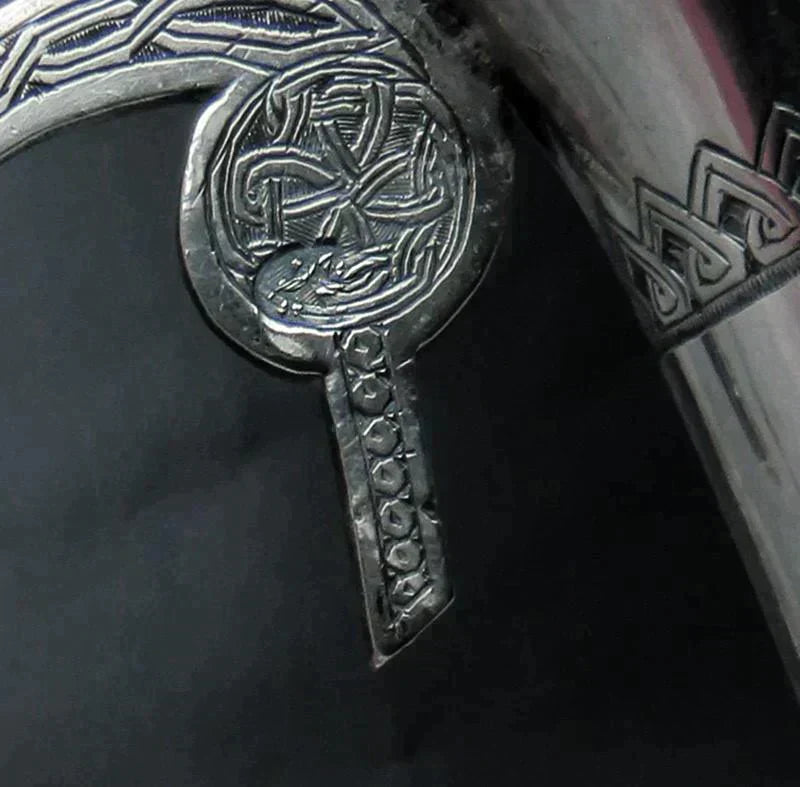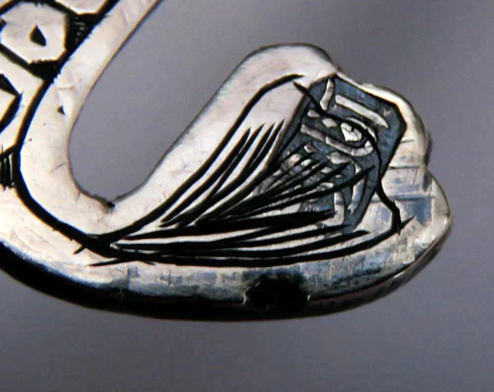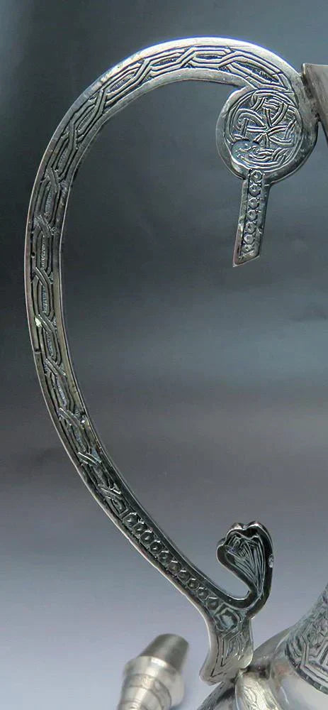 Presented is a fantastic Turkish silver decanter and cup set. The set consists of a long necked decanter or ewer and six cups. This set dates to the late 1800s or early 1900s. The decanter and cups feature intricately engraved knotwork designs, very detailed and well done. The cups are a small size, appropriate for cordials, strong coffee, etc.