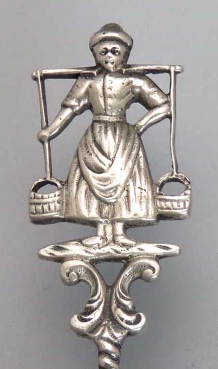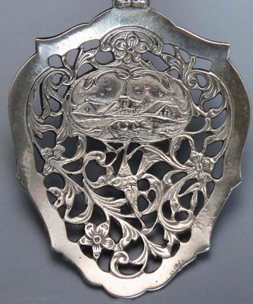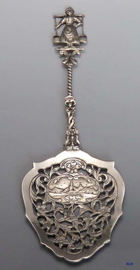 Presented is and antique Marshall field and Company sterling silver bon bon spoon. This spoon is a reproduction of antique Dutch silver. The spoon is decorated with a milk maid carrying jugs, two birds next to flowers, and a Dutch village in the fields with a bull. The business end has flowers with vines and a sparrow throughout. Let the photos be your guide.