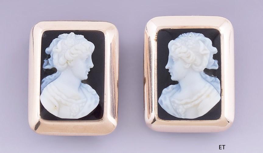 Presented is a handsome pair of carved hardstone cameo cufflinks or collar buttons in 10 karat rose gold. These cufflinks date to around the 1870s-1880s and were made in America. The cameos depict a lovely young woman in profile, with her hair done up, white against black. The carvings are very detailed and well done. The back of each cufflink is monogrammed MG.