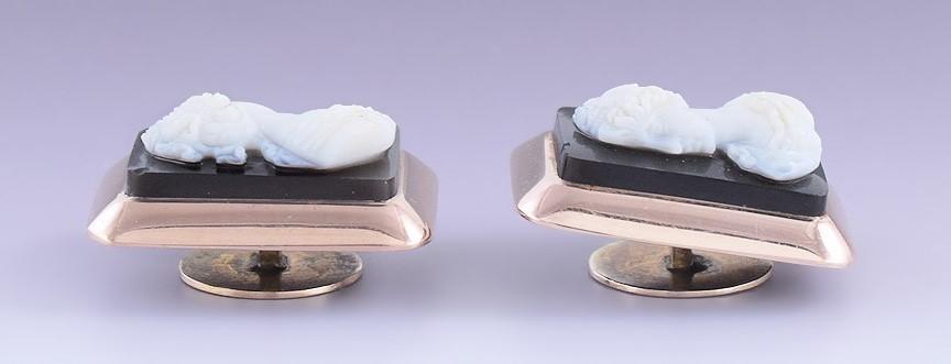 Late 1800s Handsome Pair 10k Rose Gold Carved Hardstone Cameo Cufflinks