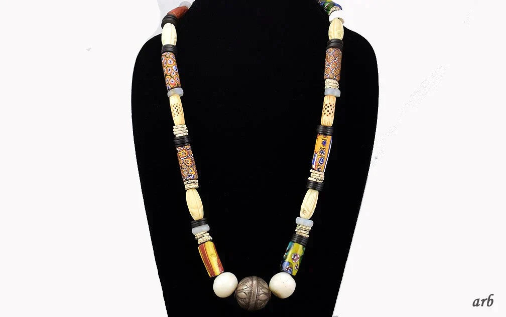 Late 1800s Italian Millefiori Style African Trade Bead and Carved Bead Necklace