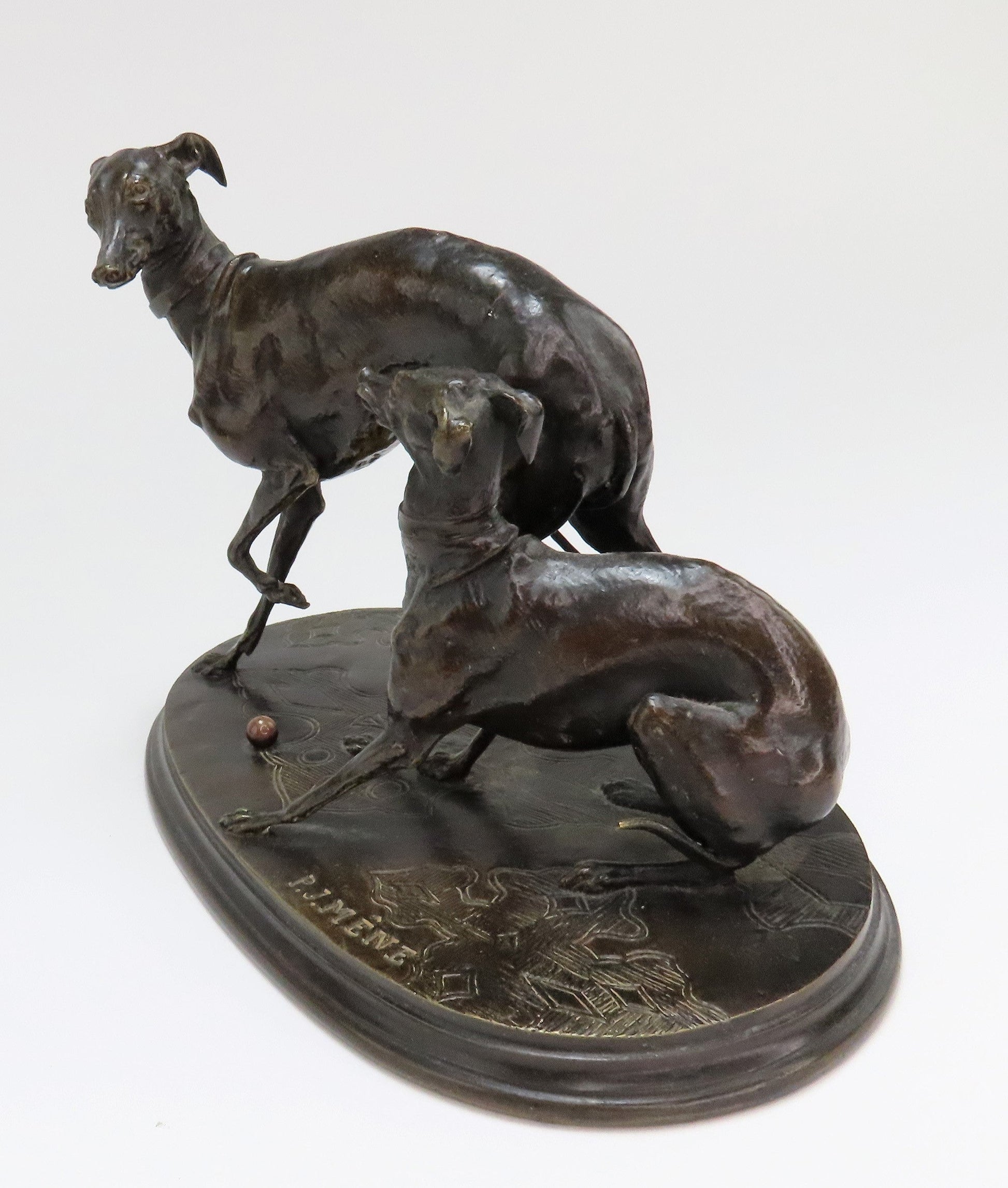 Presented is a super quality antique French bronze by renowned sculptor Pierre Jules Mene, dating to the late 1800s. Known for his lifelike depictions of the animal world, this bronze group is true to form and one of his most beloved, capturing two whippet dogs playing with a ball on a rug. The sleek dogs are sculpted in dynamic, expressive poses: one standing (“Jiji”) and one crouching (“Gisella”), presumably in the last split second before both dive for the ball. The quality of the casting is incredible, hand finished with great attention to details like the folds of the dogs' ears, their elegant paws and the pawpads on Jiji's one upturned paw, and even the Oriental pattern of the rug. The bronze has a rich chocolatey patina, which suits the subject quite nicely.
