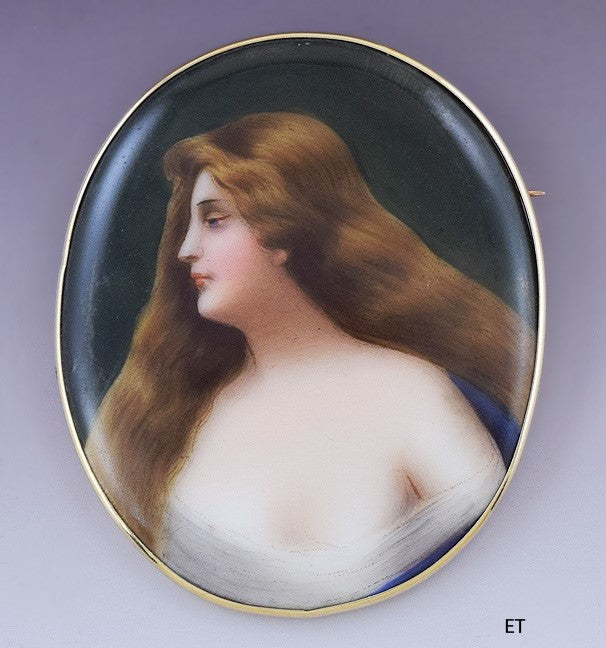 Presented is a beautifully painted portrait on porcelain in a 14 karat yellow gold frame from the late 1800s. This hand painted portrait is of a lovely young woman with long, flowing hair. The thin frame is 14 karat yellow gold and the