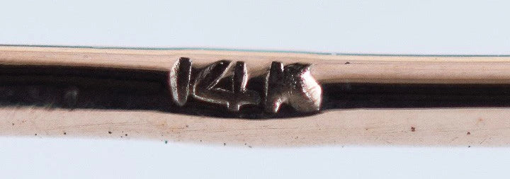 piece has its original C clasp. The pin back is marked 14K. This piece has been tested with nitric acid and is guaranteed to be 14 karat gold purity.