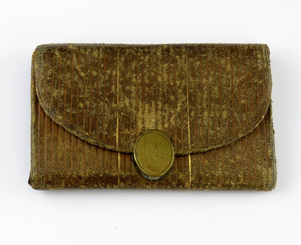 Presented is an antique leather wallet or small billfold, presumably from Canada, dating to the late 1800s. The wallet is brown leather with a ridged design and some gild detailing, with a little brass snap closure. Inside the wallet is a Canadian 1 penny bank token, dated 1837 and produced by the City Bank of Montreal, a one cent coin dated 1876, and a Canadian 5 cent coin dated 1872. We are not numismatic experts by any means, so apologies if these could be identified better.