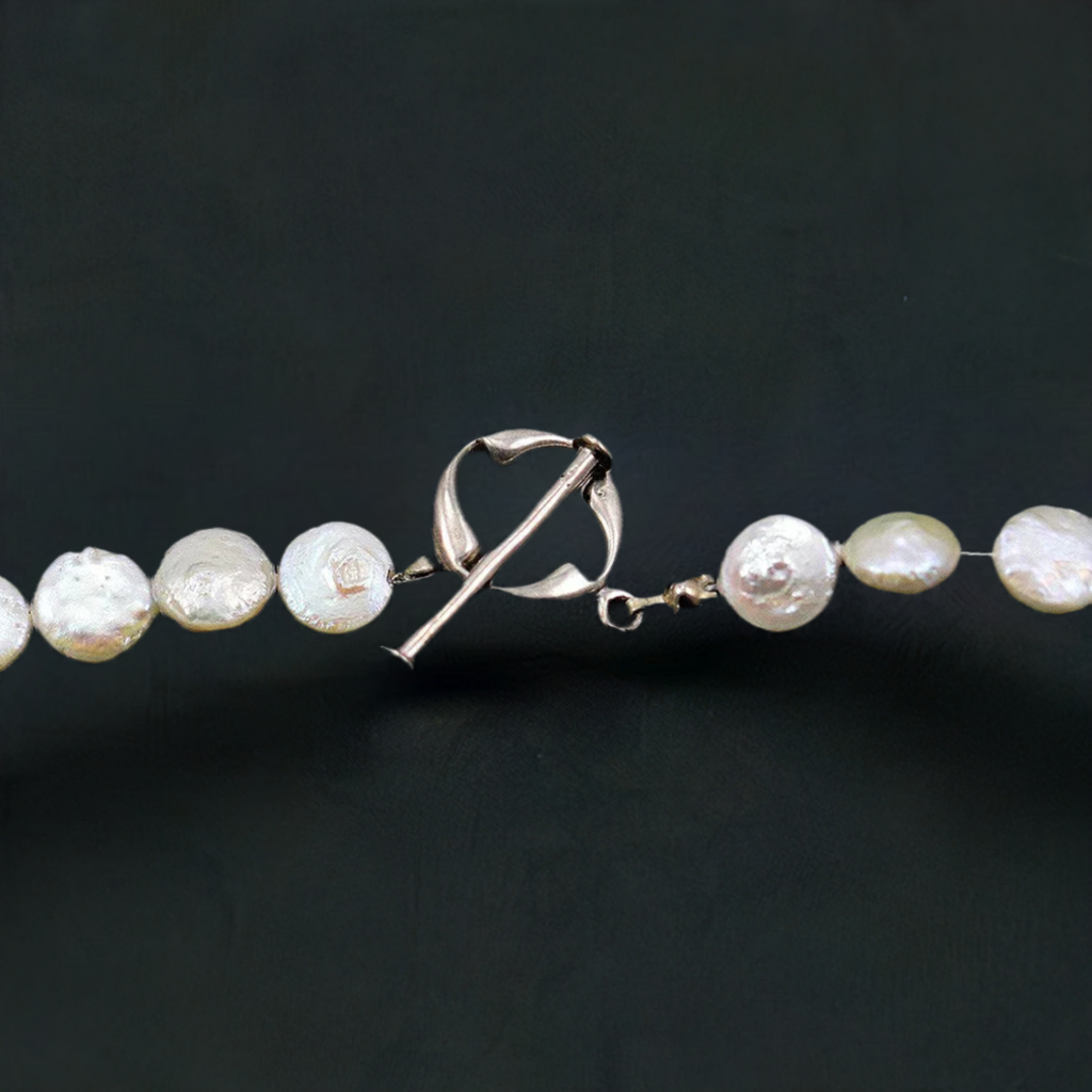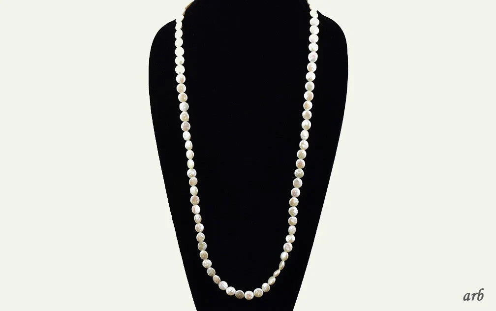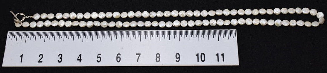 Long 38 Inch Real Flat Pearl Necklace w/ Sterling Silver Toggle Clasp